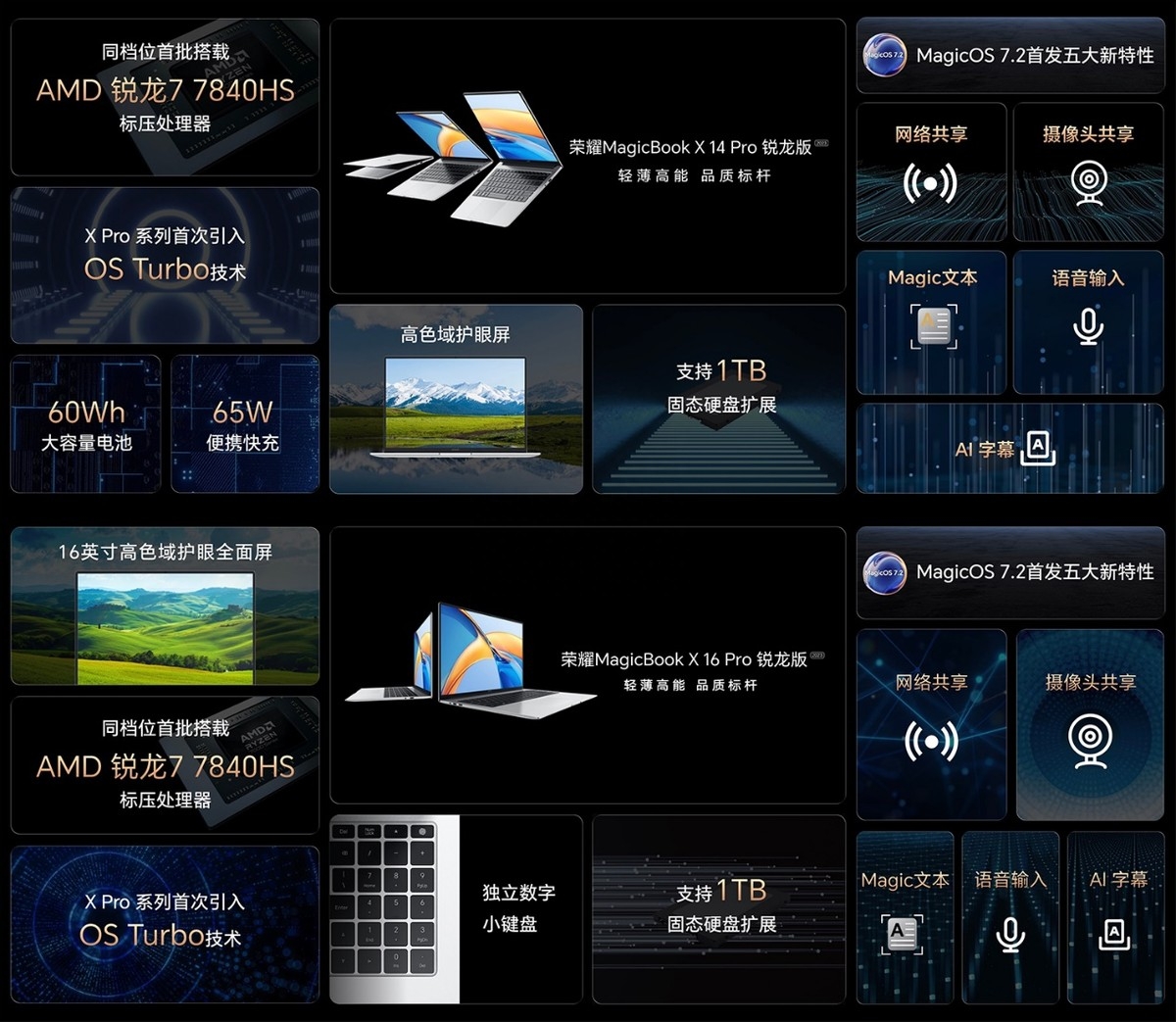 荣耀MagicBook X14 Pro是一款新品,这款笔记本也采用锐龙7-7840HS处理器,16GB内存、512GB SSD,目前售价也是4199元。从价格上来看两款笔记本比较相似,但荣耀的硬盘容量小一些,好在两款笔记本都是双M.2 SSD插槽,问题不大。接下来再看看其他指标差异。
