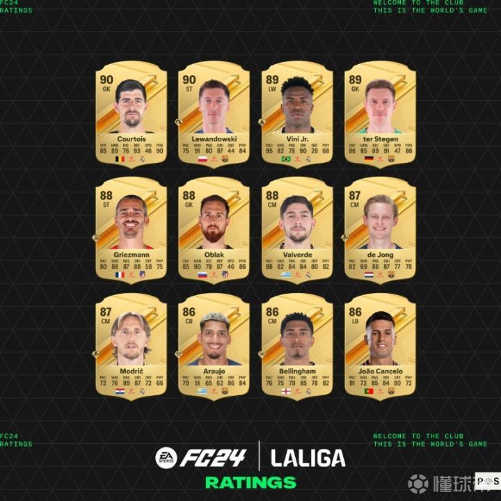 EASPORTS公布了EAFC24西甲球员能力值前24名,皇马10人,巴萨8人,马竞2人,比利亚雷亚尔、塞维利亚、塞尔塔、皇家社会各1人。