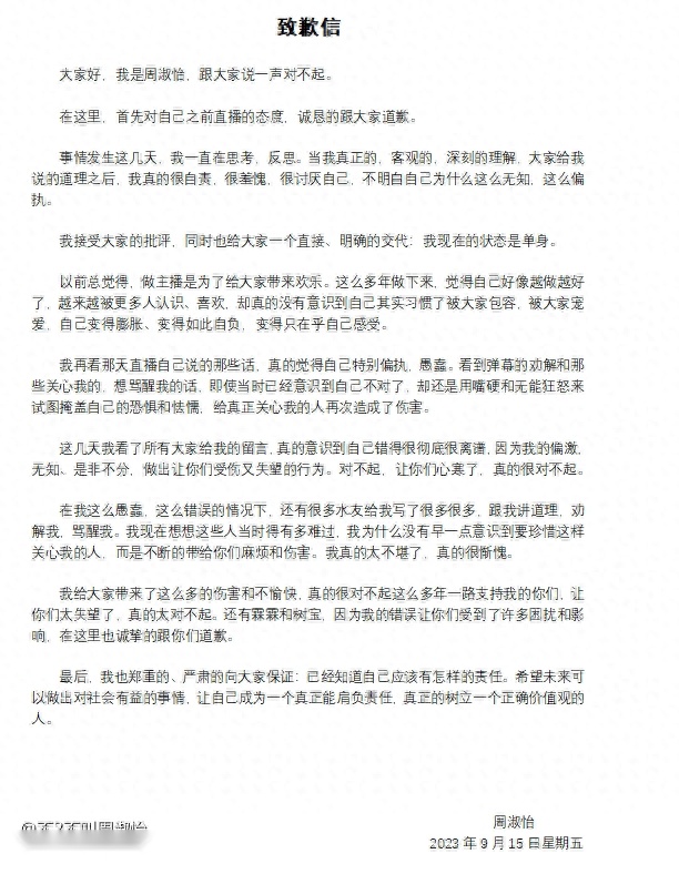 而在个人社交账号里,周淑怡也是发长文道歉: