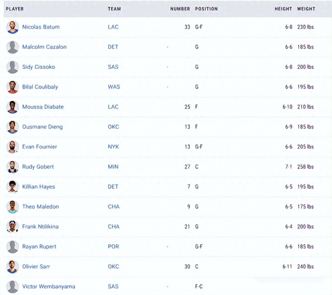据NBA官网显示,当今NBA有14名法国球员,如果算上恩比德,那么就有15名法国球员,他们是:恩比德(76人)、文班亚马(马刺)、戈贝尔(森林狼)、富尼耶(尼克斯)、巴图姆(快船)、尼利基纳(黄蜂)、马勒东(黄蜂)、基利安-海斯(活塞)、库利巴利(奇才)、乌斯曼-迪昂(雷霆)、西索科(马刺)、吕佩尔(开拓者)、迪亚巴泰(快船)、卡扎隆(活塞)、萨尔(雷霆)。