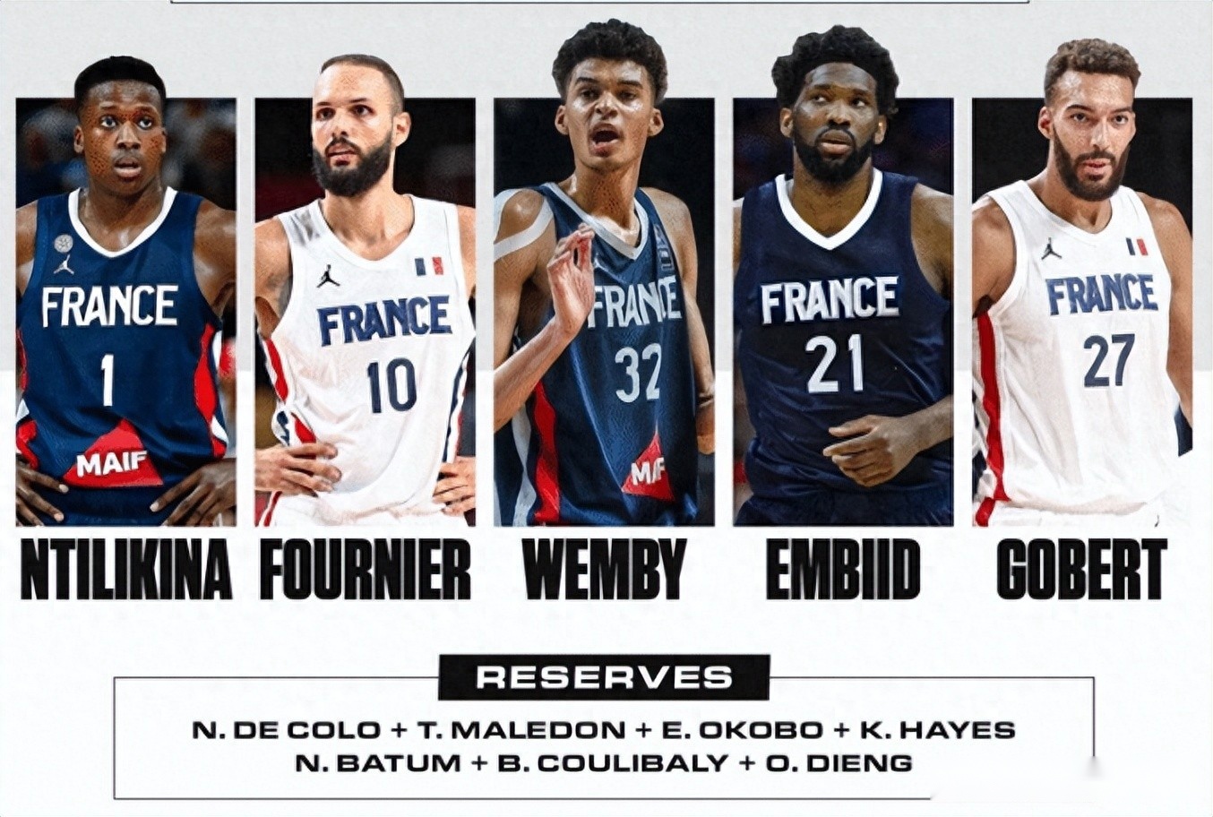 媒体预测巴黎奥运会法国队的12人阵容为10名现役NBA球员+2名曾效力过NBA的球员,10名现役NBA球员为:恩比德、文班亚马、戈贝尔、富尼耶、巴图姆、尼利基纳、马勒东、基利安-海斯、库利巴利、乌斯曼-迪昂,2名曾效力过NBA球员为:德科洛(曾效力马刺、猛龙)、奥科博(曾效力太阳)。