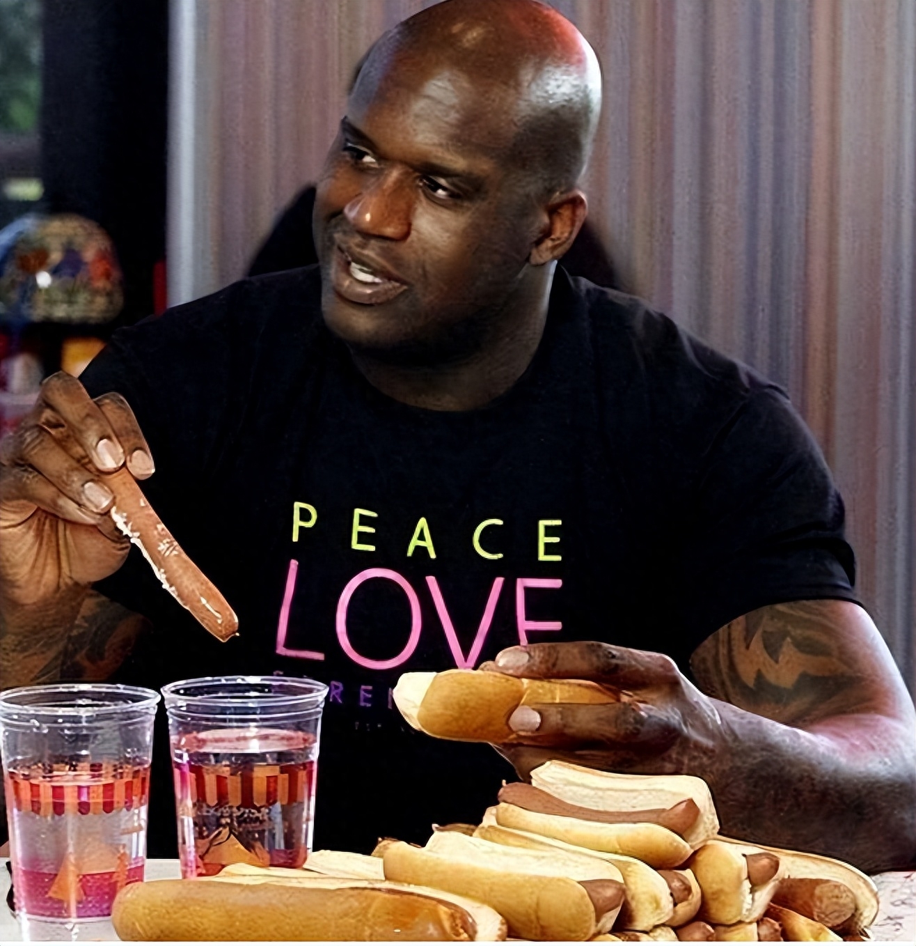 奥尼尔一直很能吃,打球期间就没有任何忌口,他想吃什么都可以。他退役后,身材看着胖,巅峰据说到了400斤。他曾参加过一次大胃王比赛,5分钟就吃了36根热狗,最后还拿下了大胃王的称号。奥尼尔5分钟的饭量,我一天都吃不完。