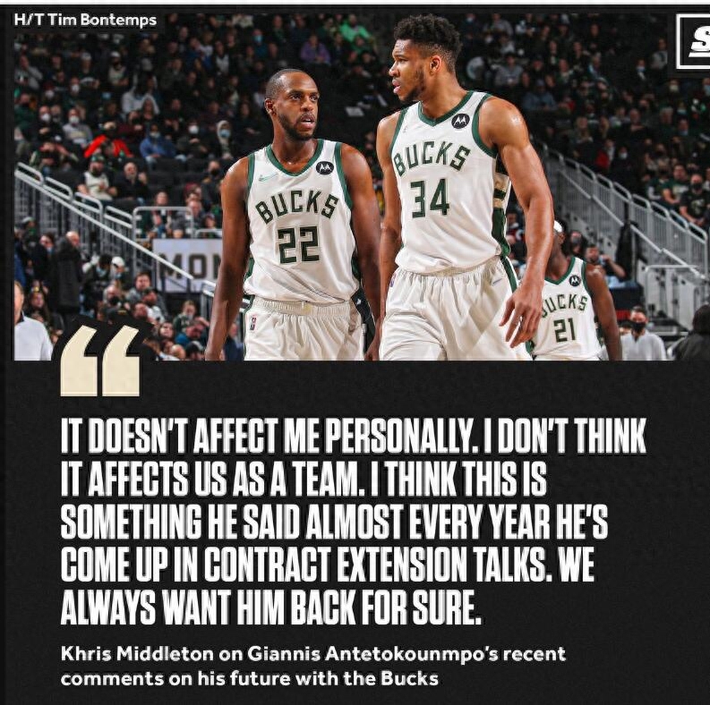 雄鹿球员克里斯-米德尔顿谈到扬尼斯-阿德托孔博可能离队的话题。