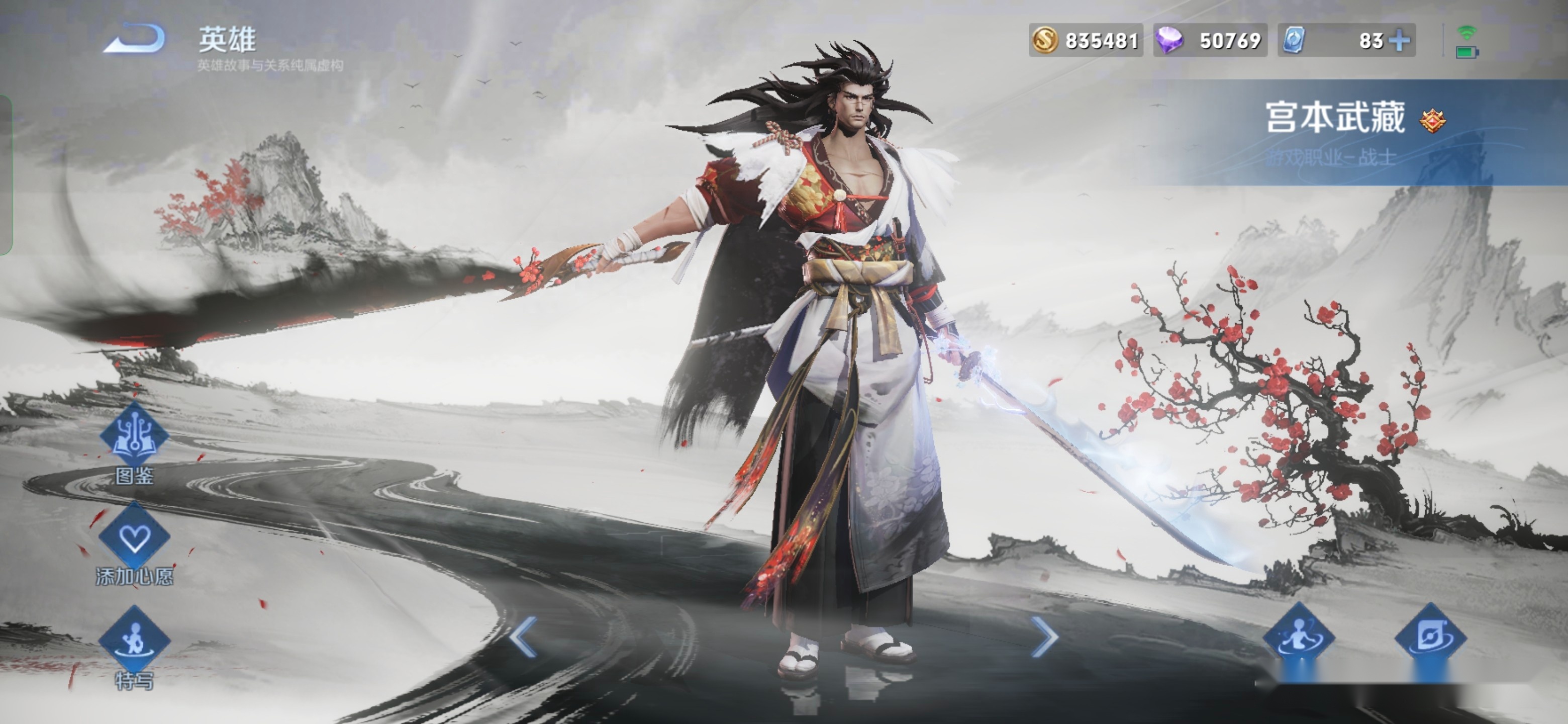 宫本武藏新皮肤造型有两个主要元素,分别是梅花和傲雪,因此服饰以红白为主色调,并加入了花雪图案点缀,凸显其潇洒不羁天涯刀客的气质,另外手持双刀变成了红色和黑色,附上白烟和黑烟缭绕的效果,局外背景则是梅花远山的水墨画。