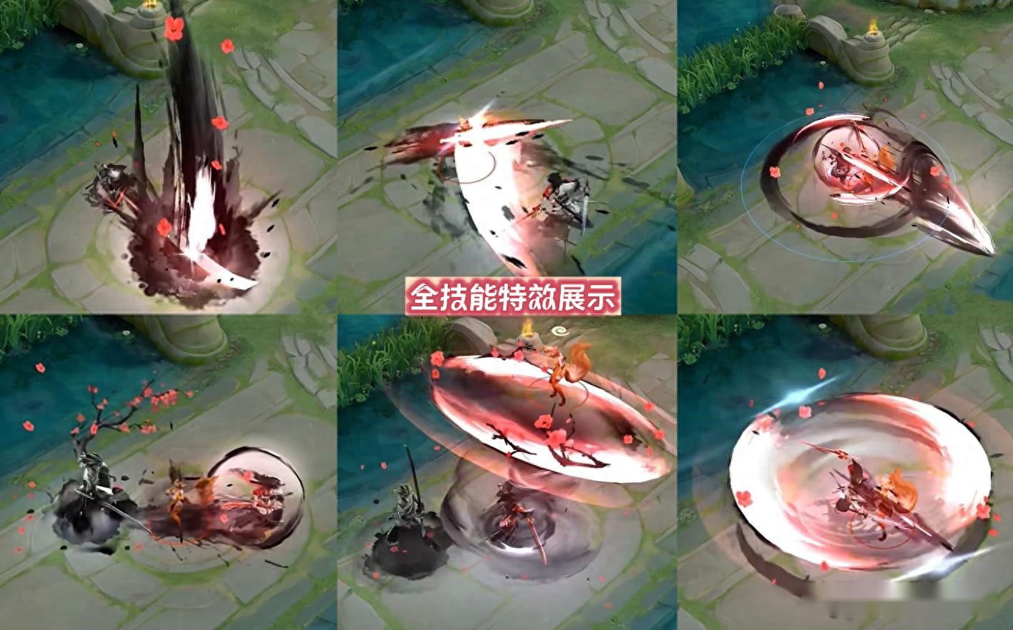 “惊梅引”的技能特效以水墨元素为主,普攻、一重势和二重势都有水墨、红色刀芒出现,并且召唤一只水墨巨剑从天而降。1技能释放出黑白红相间的刀芒;2技能位移后,会在原地留下红梅和水墨残影;大招则是水墨四溅和红梅龙卷风的特效,全技能都附带梅花掉落效果。