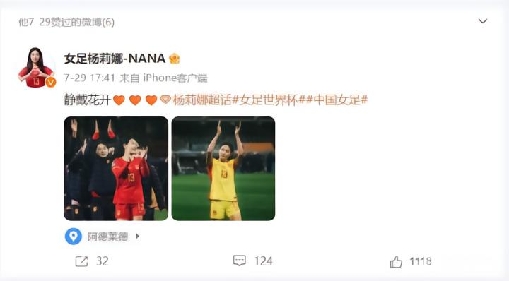 7月29日,杨莉娜曾发布了一篇社媒,文案为:静戴花开。并且,这条微博也得到了戴伟浚的点赞,同时可以发现,几乎杨莉娜的每一条社媒,都能得到戴伟浚的点赞。