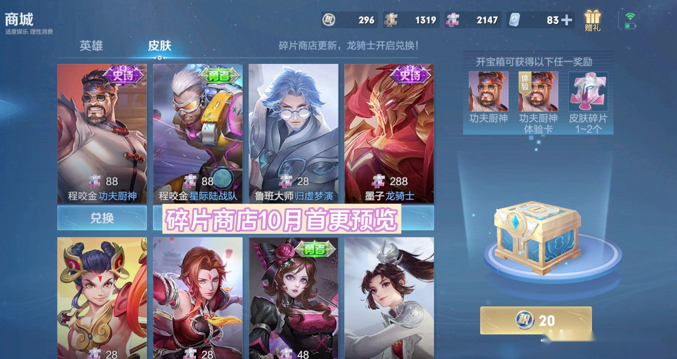 结语:王者荣耀碎片商店十月首更预览,新勇者皮肤上架,项羽苍穹之光回归,普通史诗10选3,同时金蝉和暃伴生皮肤有望返场,“月桂送福”活动开启,典韦和程咬金皮肤免费获取。那么这次更新有你想要的史诗在列吗?