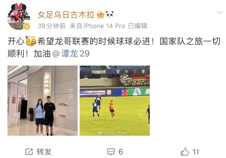 晒照的同时,乌日古木拉写道:“开心。希望龙哥联赛的时候球球必进!国家队之旅一切顺利!加油!”随后,谭龙也留言回复:“加油。”