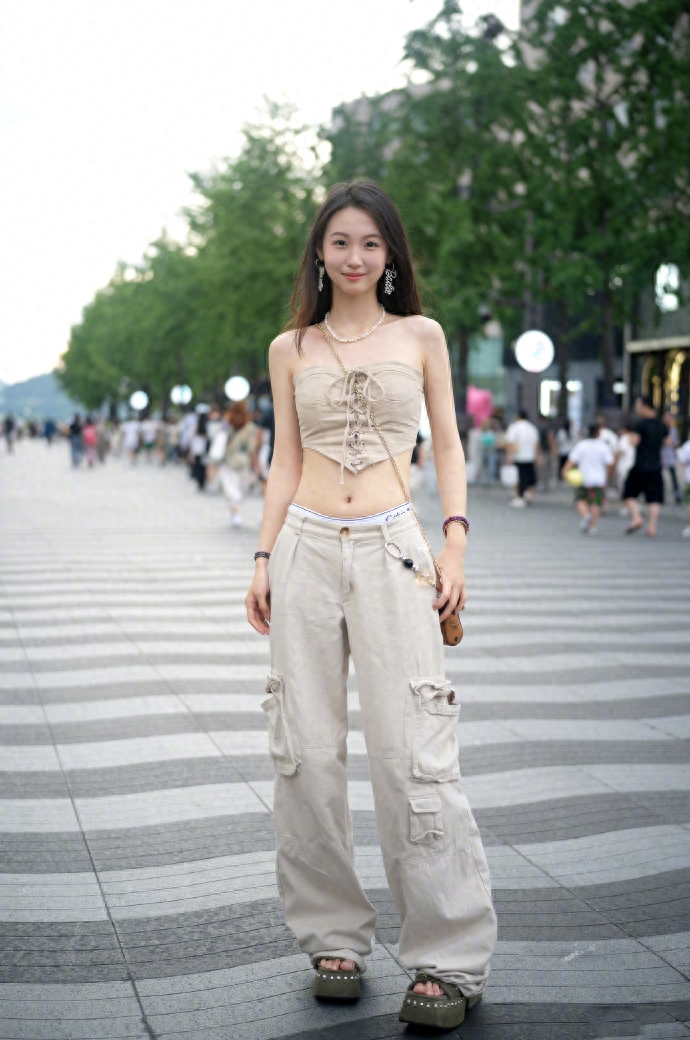 一般来说,塑身衣都带有一定的露肤感,在搭配上可以增加一些配饰,来丰富造型层次感和时髦度。比如项链、耳环和手链,这些基础配饰都能起到点睛之效。下半身宽腿工装裤结合“露内裤”穿法,时髦又个性。