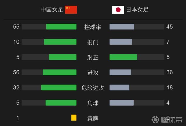 控球率中国女足高于日本女足,射门数为10-7,射正数两队相等,日本队依靠反击多次打出威胁进攻,中国女足在3球落后的情况下连扳两球最终3-4不敌日本女足。