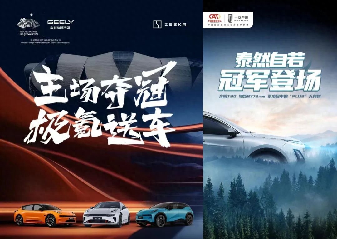 吉利旗下的极氪汽车推出“致敬中国冠军”亚运主场礼遇,杭州亚运会期间,极氪向荣获中国第001金、第101金、第201金及收官金牌的亚运健儿、夺冠的极氪亚运突破大使赠送价值30-40万的极氪001,向打破世界纪录并夺冠的亚运健儿敬赠价值百万的极氪001 FR超跑,向“你心中最X的中国冠军”票选活动中人气最高的运动员赠送极氪X一辆(注:该活动被王楚钦的粉丝“血洗”)。据统计,极氪共计将送出15辆汽车。