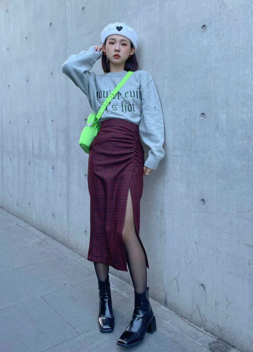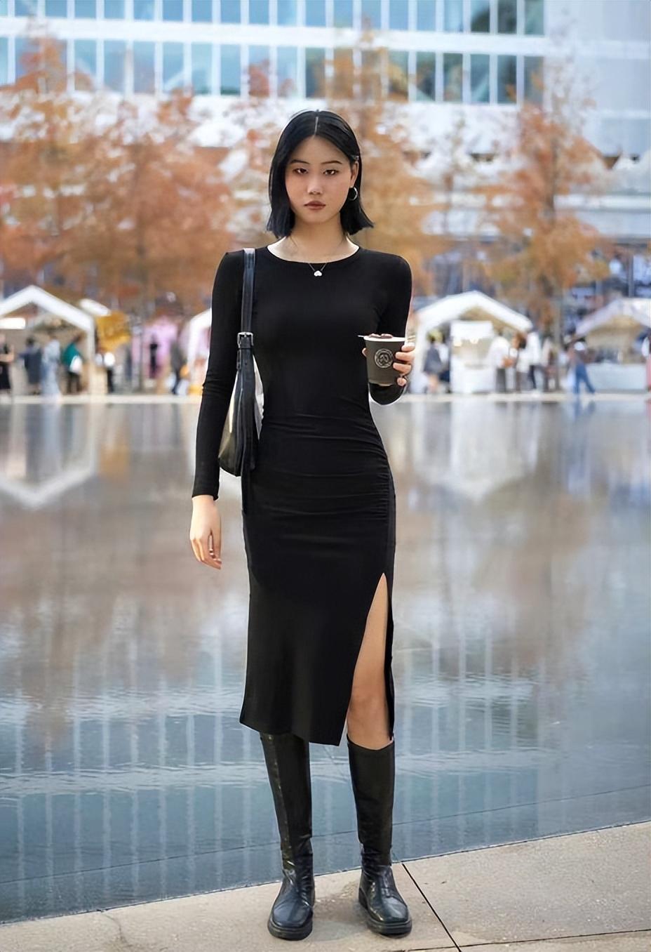 另外不喜欢纯黑色的设计,可以来点别样的色彩,裙子和靴子的颜色不同,给人的视觉感官也会有所不同,增加设计感的同时还不会那么的单调,很有细节范。