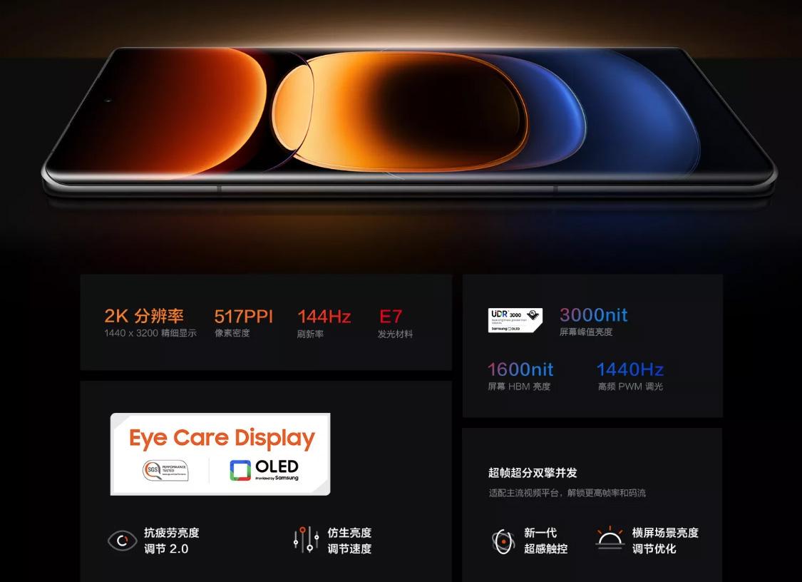 屏幕为6.78英寸AMOLED,3200×1440分辨率,最高支持144Hz高刷,曲面屏,三星E7发光材质,3000nit峰值亮度,1440Hz PWM调光。
