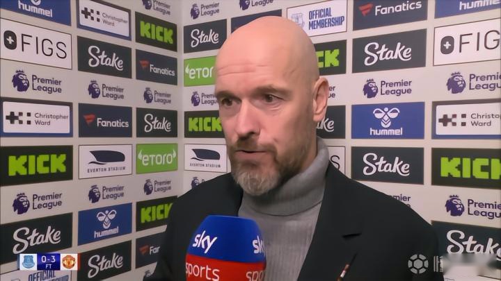 在英超第13轮客场3-0击败埃弗顿之后,本场比赛因为累积黄牌停赛只能在看台上观战的曼联主教练滕哈格接受了采访。