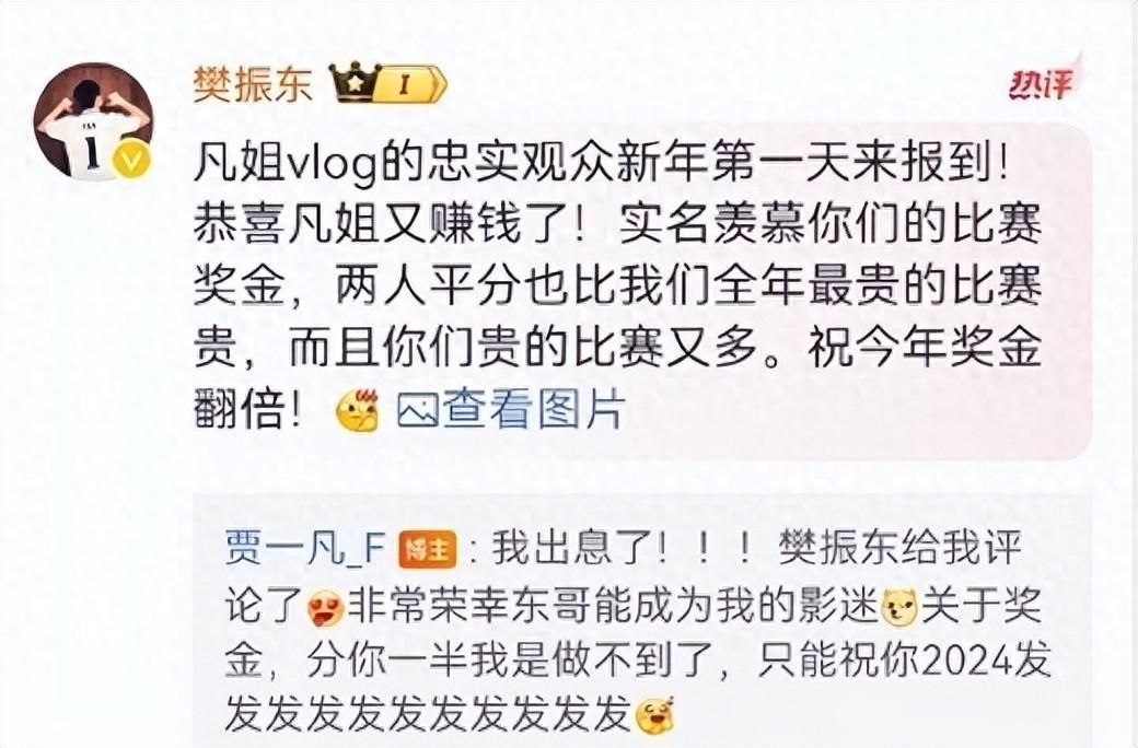 而作为世界第一的樊振东就此实名羡慕其他项目的选手,眼馋羽毛球项目的奖金。樊振东主动评论国羽世界冠军贾一凡的动态,直言实名羡慕凡姐的奖金,樊振东具体是说:“ 凡姐vlog的忠实观众新年第一天来报到!恭喜凡姐又赚钱了!实名羡慕你们的比赛奖金,两人平分也比我们全年最贵的比赛贵,而且你们贵的比赛又多。祝今年奖金翻倍! ”