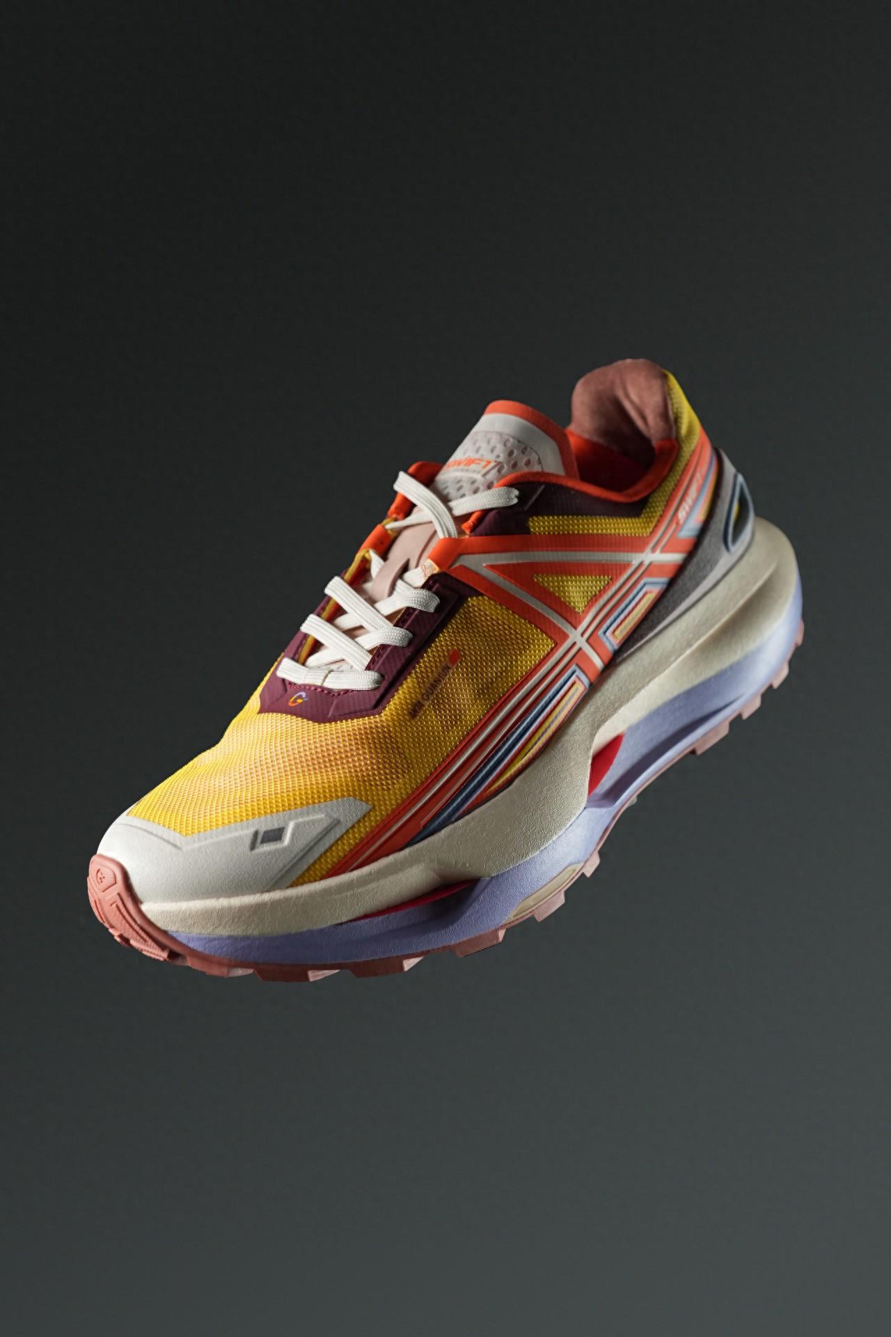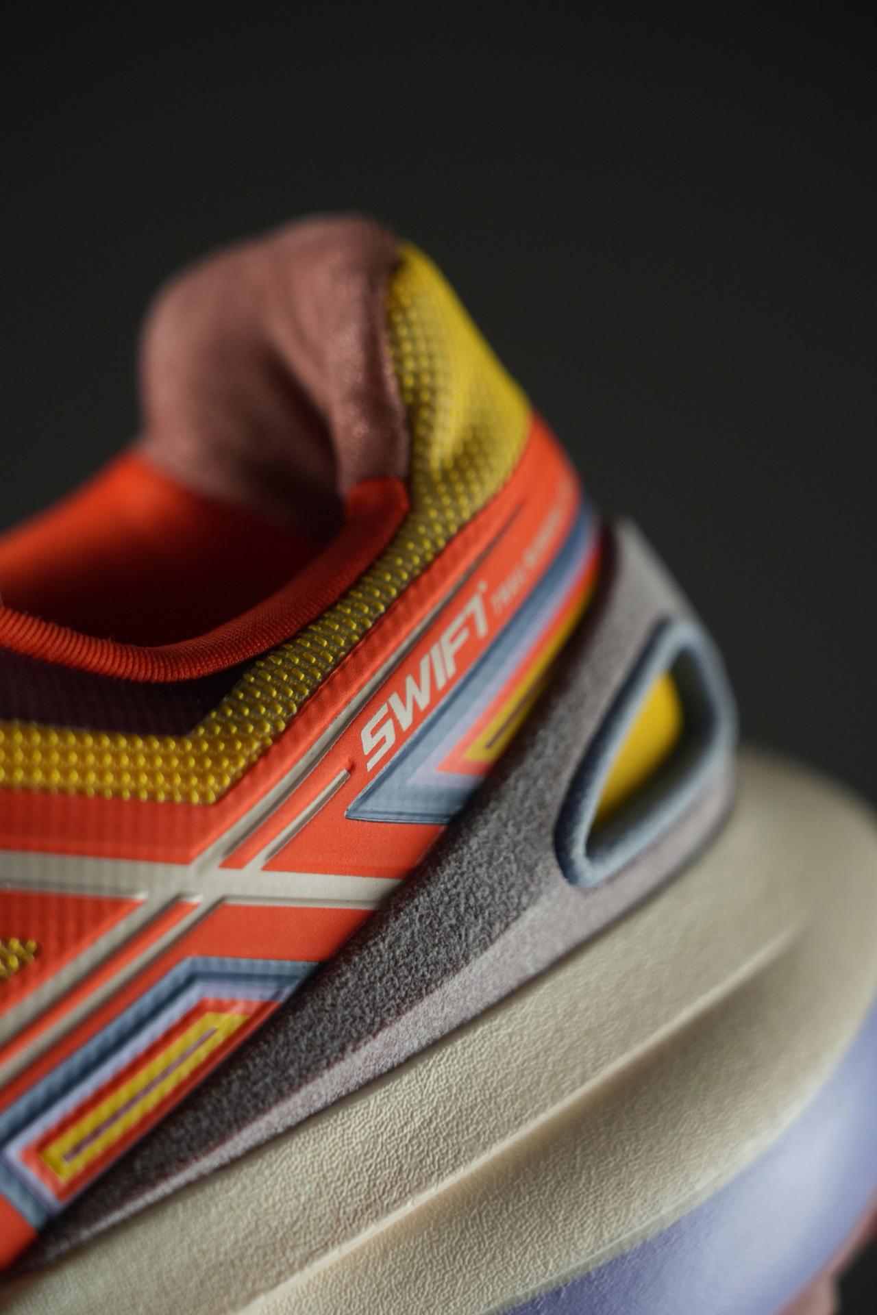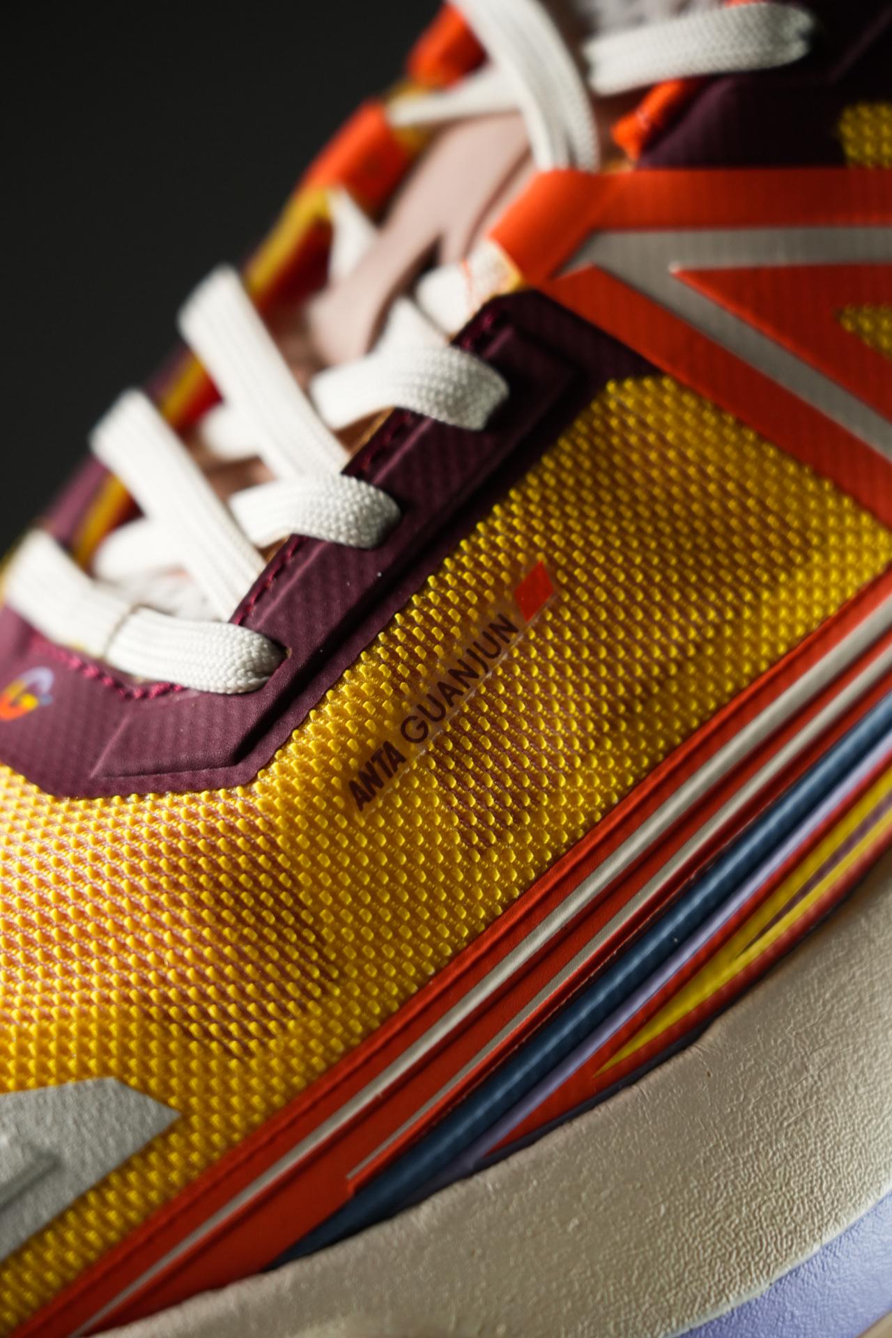 这双鞋没有安踏标志性的logo,而是以一种新的形式展现,就是鞋侧面的A,其中A的横杠用一个贯穿正侧面的彩条来组成。