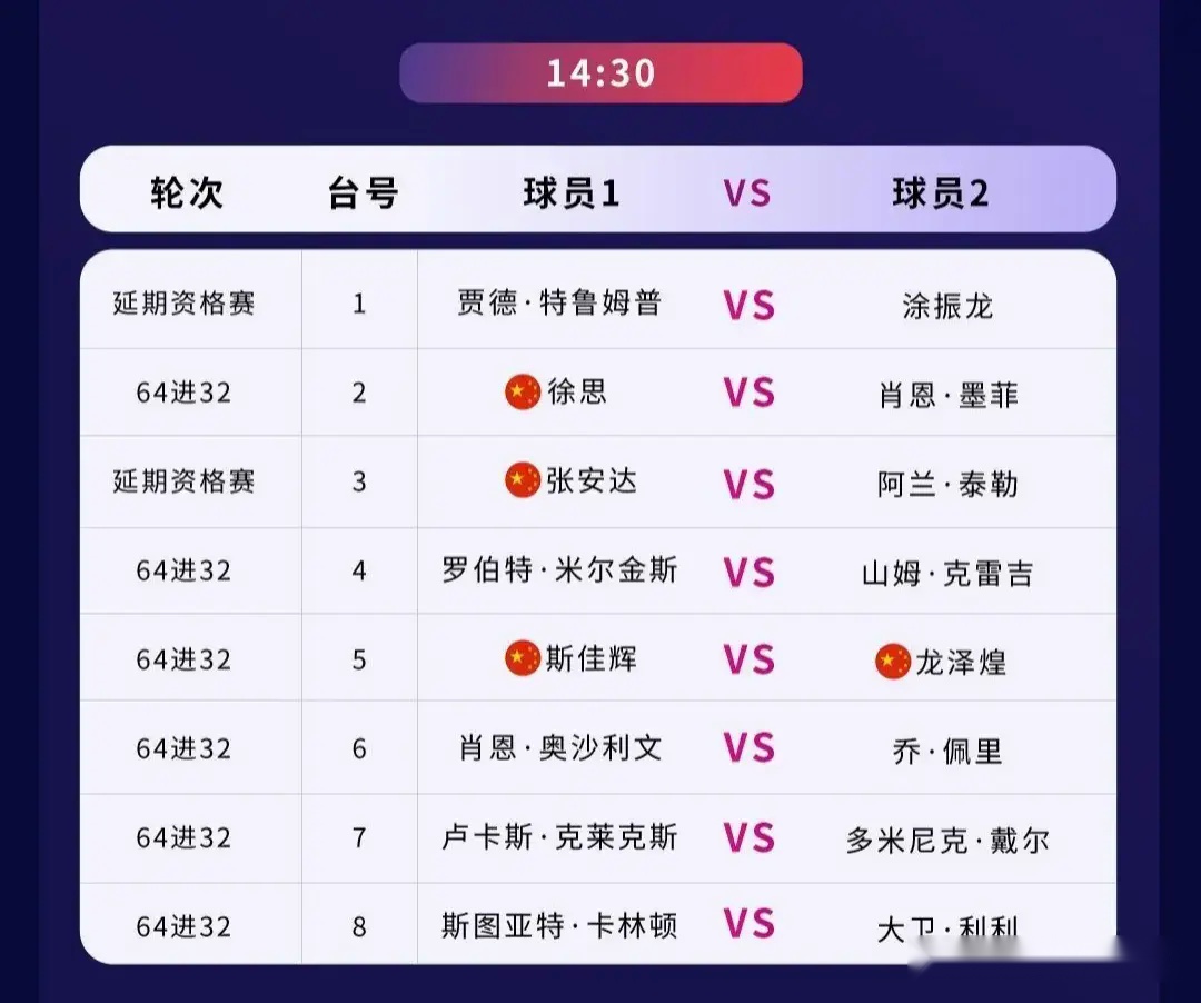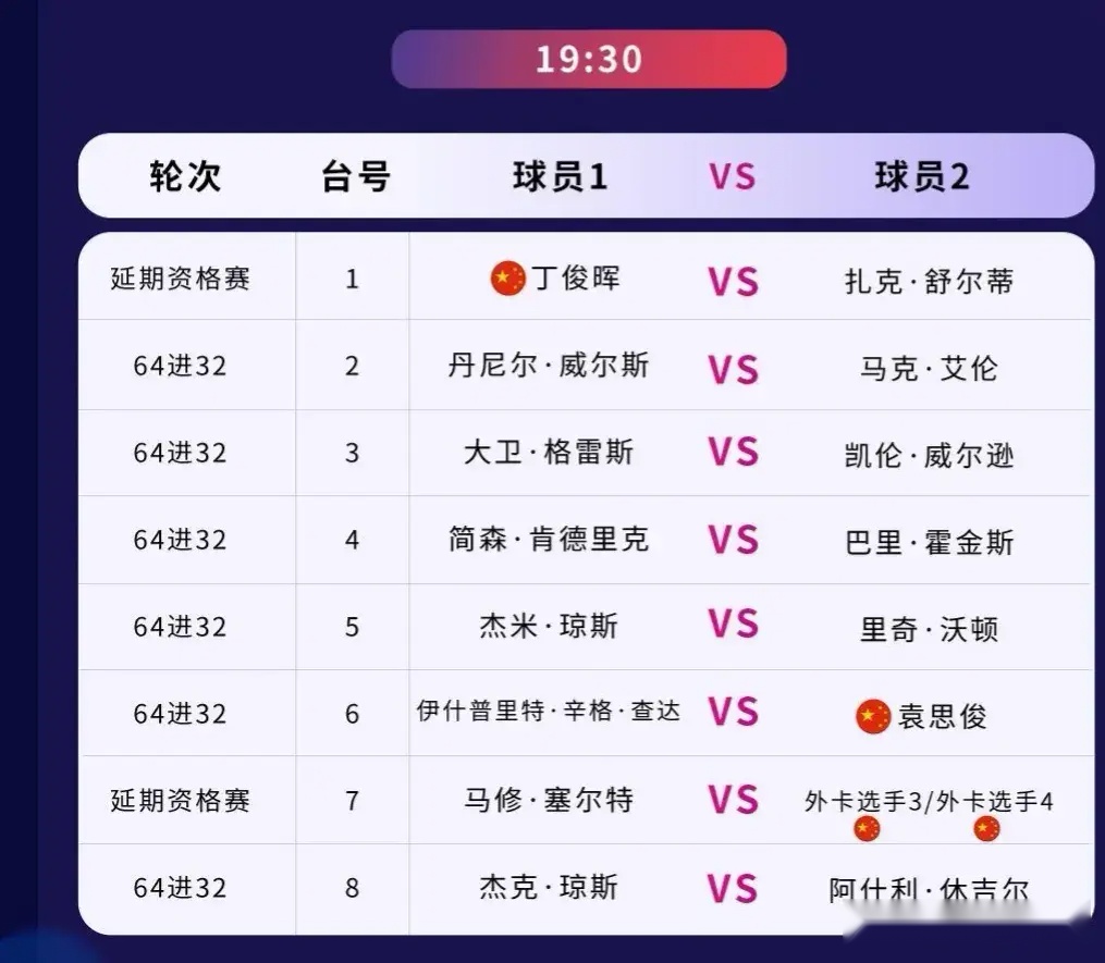 第一比赛日包括张安达、丁俊晖在内的国内高手将悉数亮相,我们来看看两位中国顶级高手的比赛安排,张安达的延期资格赛将在下午14时30分 ,张安达的对手为阿兰泰勒,不出意外张安达应该顺利晋级。另一位中国一哥丁俊晖将在19时30分迎战玉山公开赛的第一个对手扎克舒尔蒂。