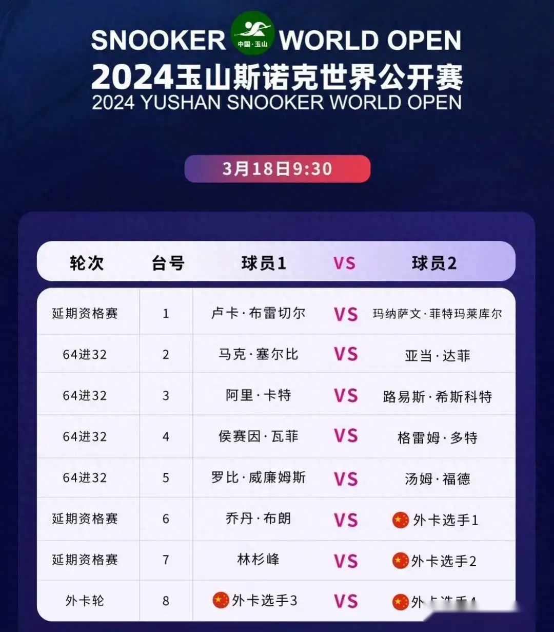 北京时间2024年3月18日,2024玉山斯诺克世界公开赛将进入第一比赛日的较量,64进32的比赛、延期资格赛和外卡轮将同时打响,第一比赛日的比赛将分为3个阶段进行,分别是上午9时30分、下午14时30分和晚间19时30分三个阶段进行。