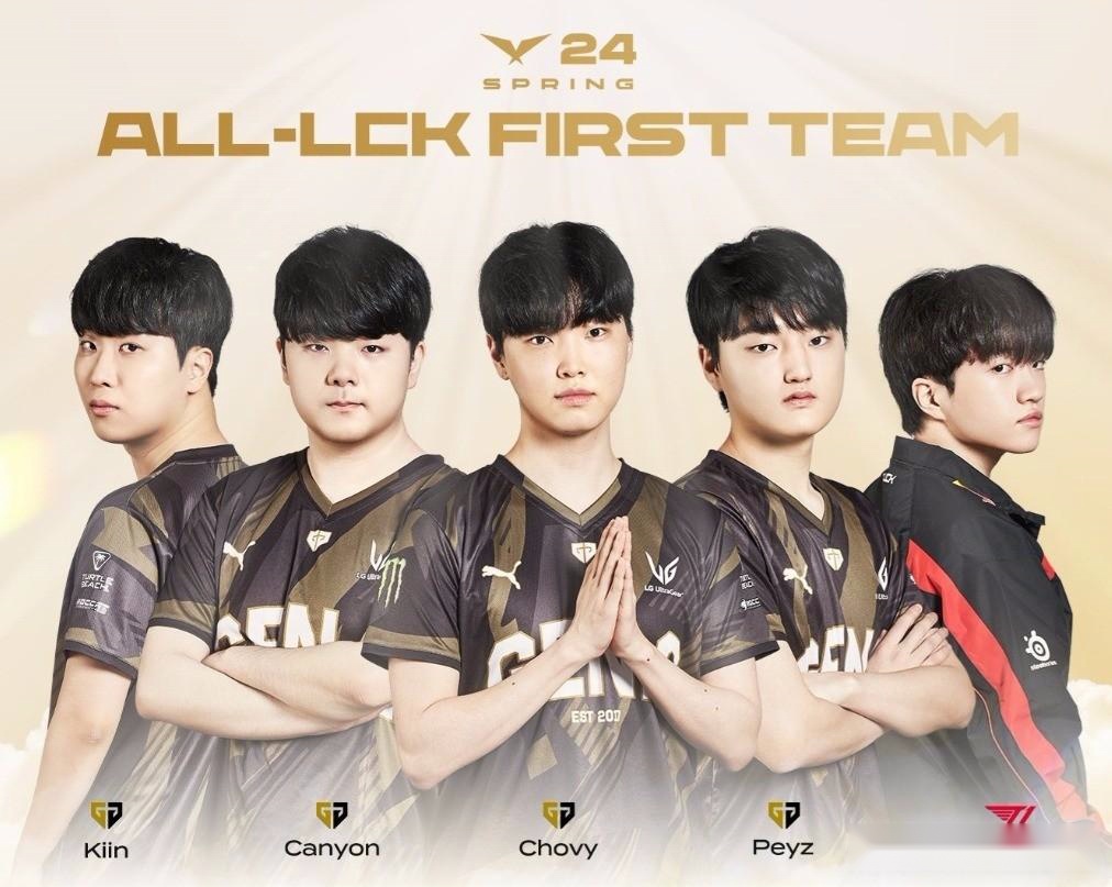 常规赛一阵如下,上单给到kiin,打野是canyon,中单是chovy,AD是peyz,辅助是keria。四个GEN队员,加上T1的辅助。