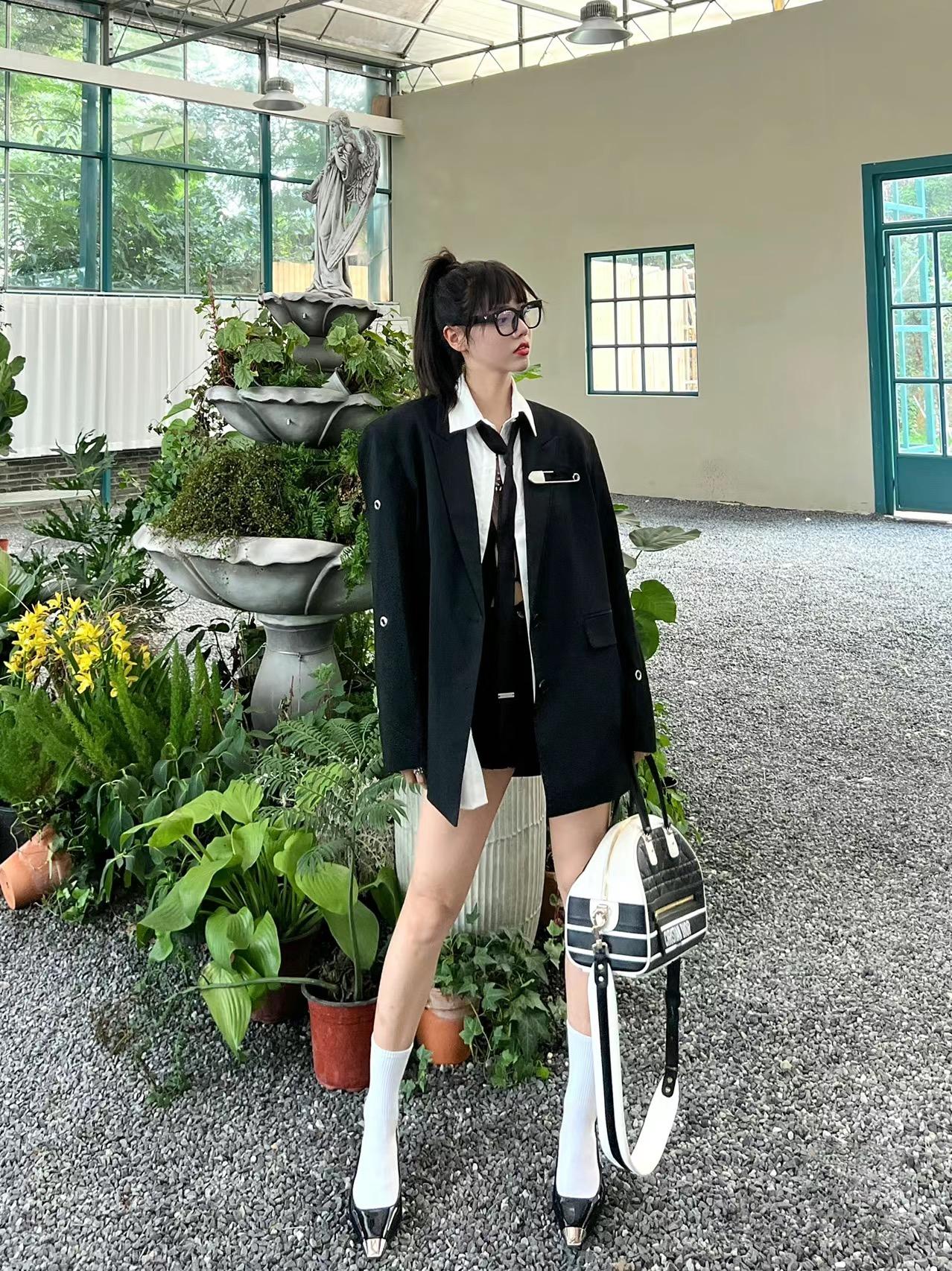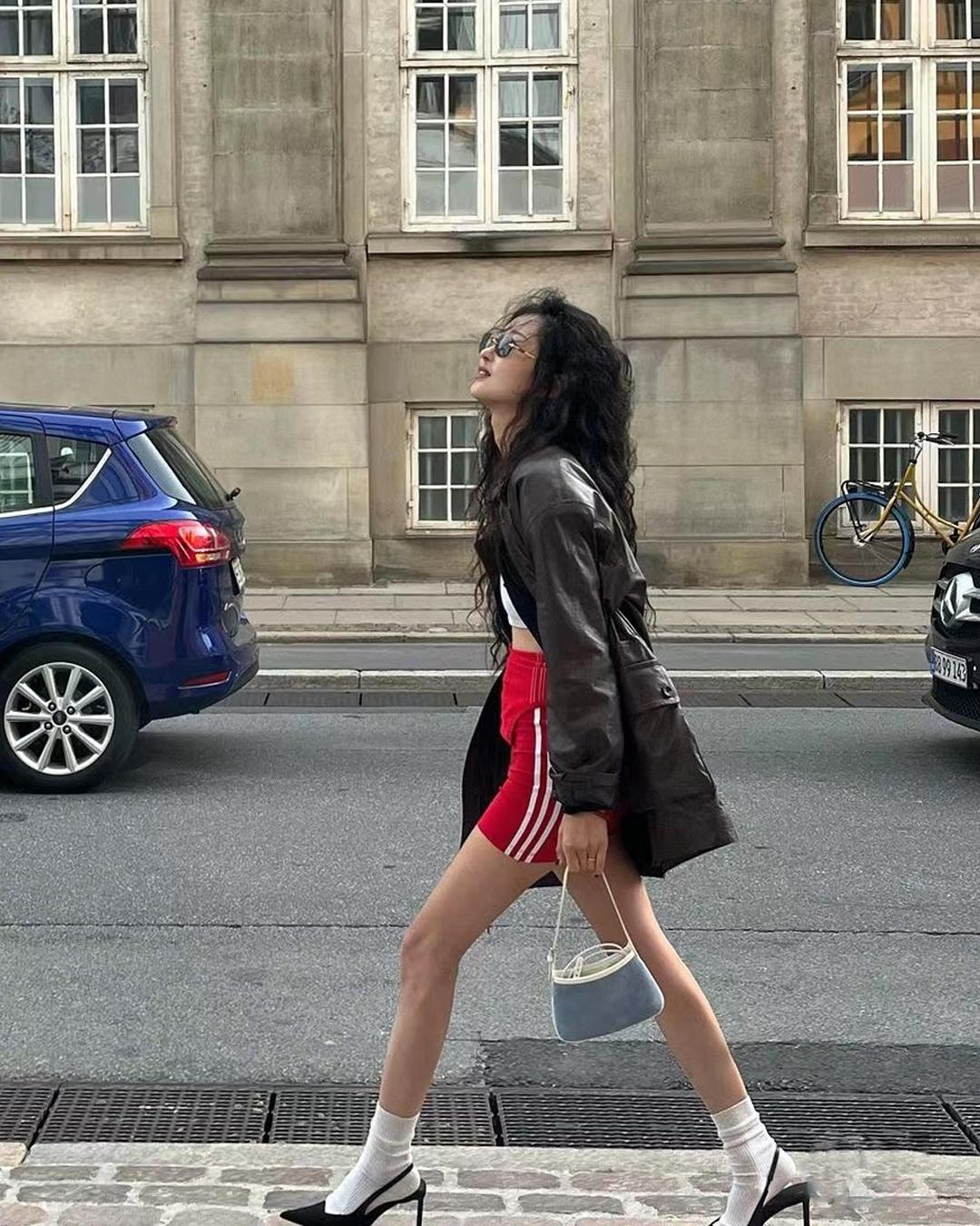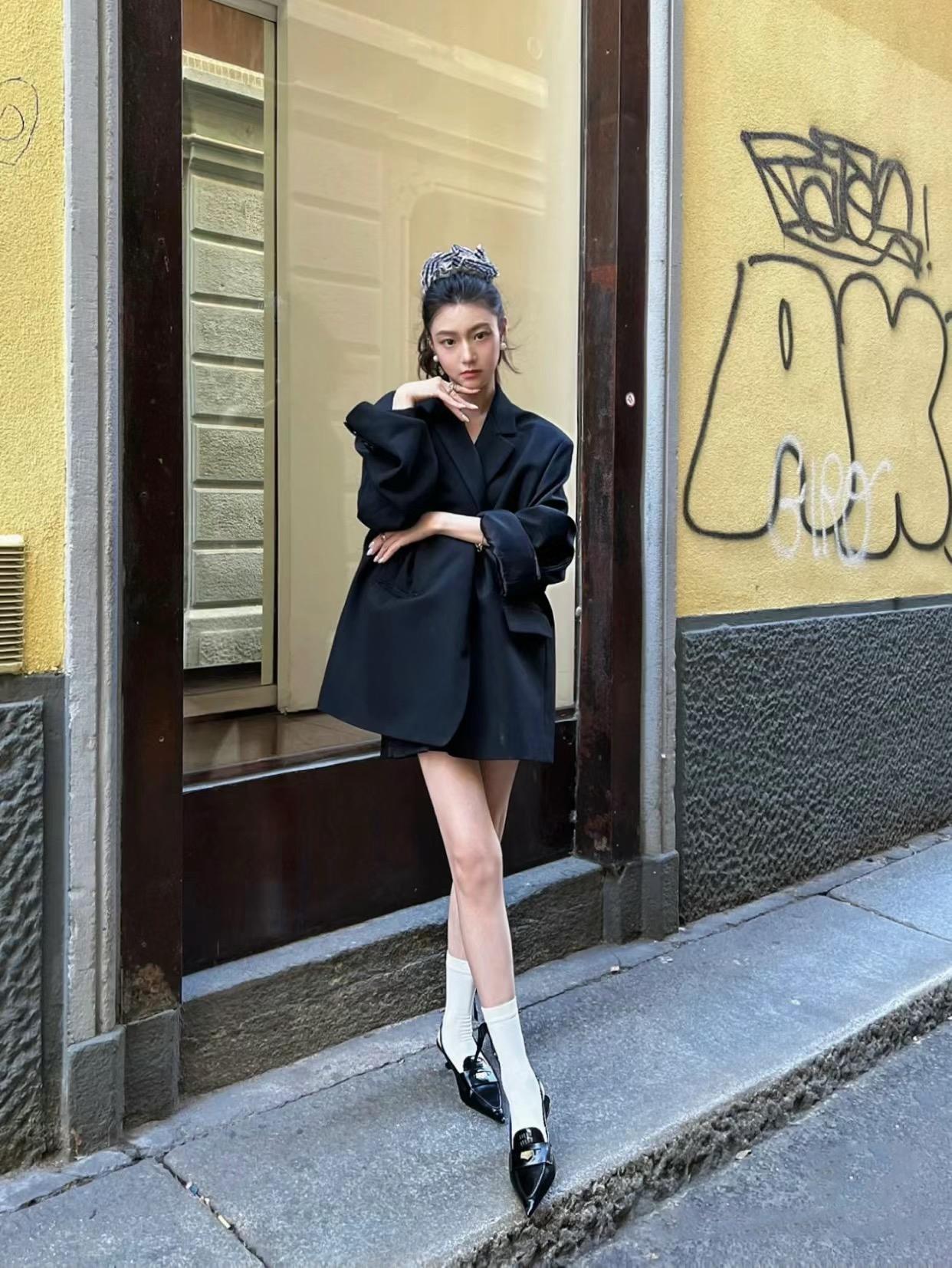 无论是对于小个子还是本身身高条件优越的女生来说,穿高跟鞋配白袜时,都可以采用“下衣失踪”的穿法, 既能凸显下半身单品亮点,也能凸显腿长 。搭配选择版型偏长偏宽松的上衣,刚好遮住臀胯位置,视觉上更显高。