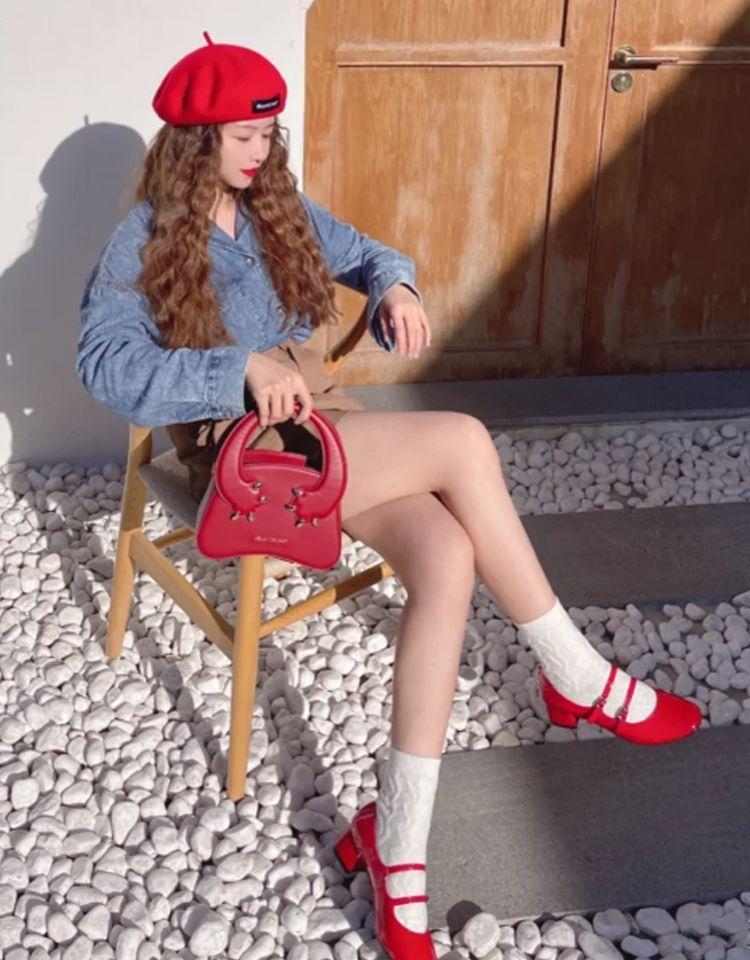 为了避免高跟鞋和白袜在穿搭中显得突兀,可以在配色细节上多花点心思,来平衡造型的整体感。高跟鞋、包包、帽子都统一成红色, 上下配色呼应,强调单品之间的协调性 ,虽然风格不同,但组合在一起却意外时髦和谐。
