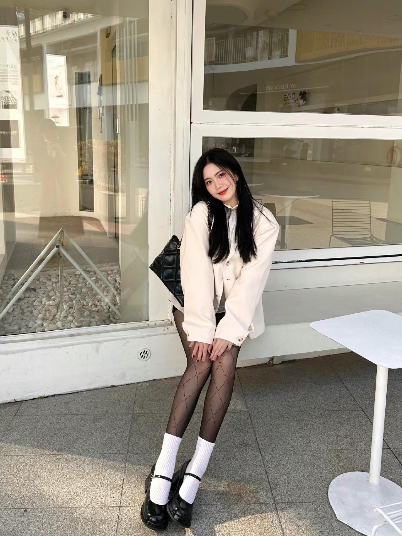 对于白袜的选择,首先在于其袜筒的长度,太短或太长都不太合适,尤其是长度过膝的款式会显得过分夸张违和。 袜长尽量控制在脚踝以上、小腿位置 ,刚好包裹住腿型的纤细部位,显瘦又和谐。