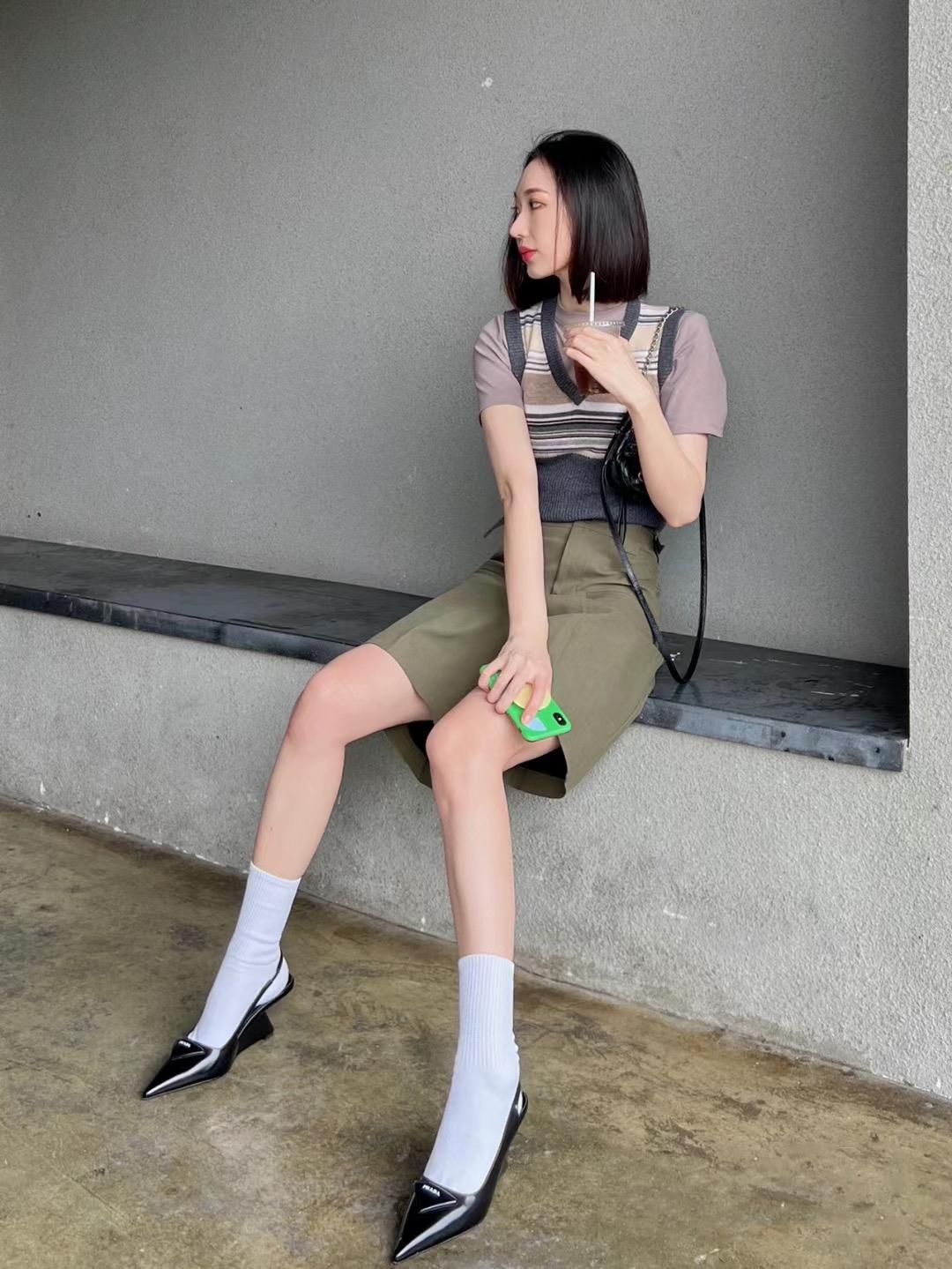 在“高跟鞋+白袜”的基础上,搭配针织马甲叠加短袖t恤,并配上中裤,完美诠释了最近流行的知识分子风。简约高级的同时也强调了时髦感,不会让造型显得过于乏味或太过性感,单品之间的风格拿捏得恰到好处。
