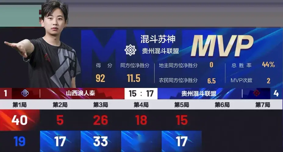初登赛场,贵州队前四战分别打出3:4、4:0、4:2和4:1,不仅“体验”了所有可能的比分,且状态愈发迅猛!贵州大腿 混斗苏神 则再次斩获 全场最佳 , 成为本届春季赛第三位“MVP梅开二度”的选手!