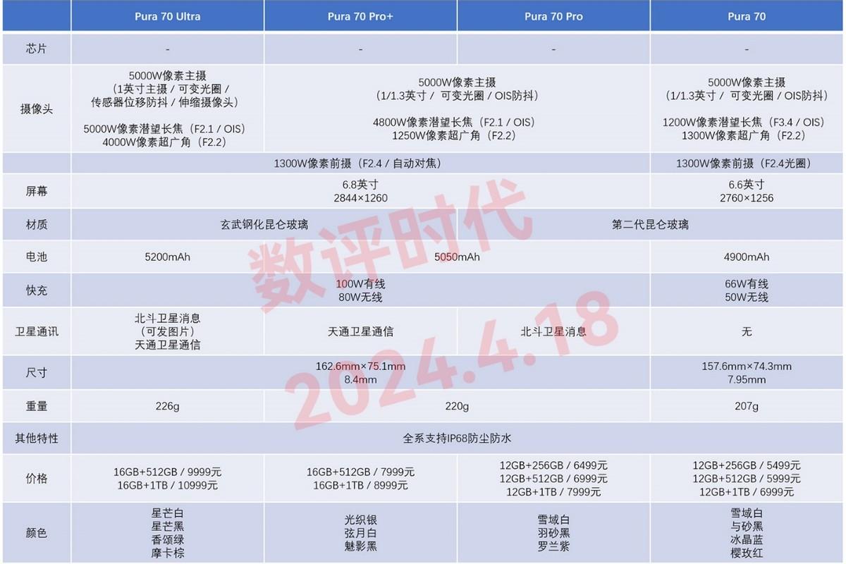 这次推出的整个系列包含华为Pura 70 Ultra、华为Pura 70 Pro+、华为Pura 70 Pro和华为Pura 70四款机型,价格跨度从5499元到10999元。四个版本有哪些区别?今天就来依次讲解一下,文末还有总结图表能一次全部看懂,但我建议你还是慢慢看。