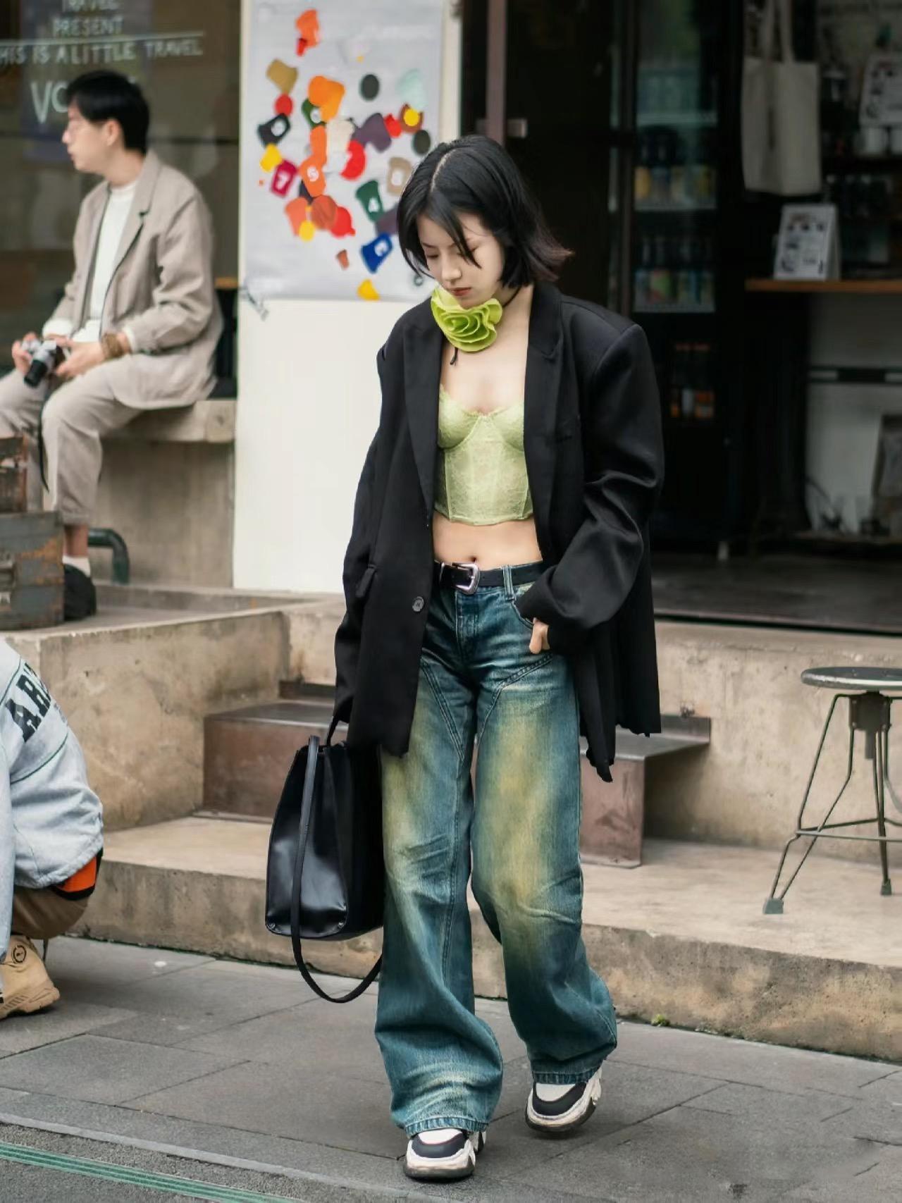 在露腰装外面叠加一件廓形西装外套,强调单品之间的风格冲突,也不影响腰身位置的露肤,整体更显随性松弛。