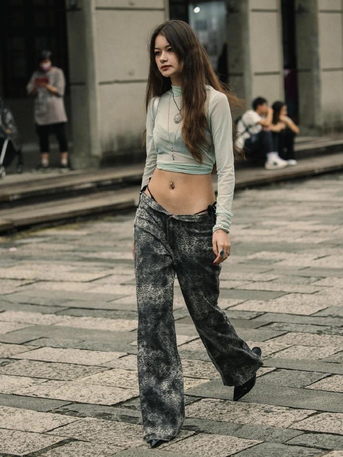 “露胯”穿法的精髓在于“露胯下装”,包括露胯裤和露胯裙,采用了 低腰、低胯 的剪裁设计,区别于普通的下装更多了性感与时髦。虽然整体腰胯位置往下移,但不会掉下来, 刚好卡在腰胯位置 ,展现出一种随性不羁的时髦态度。