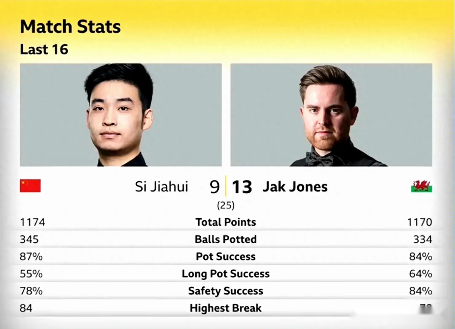 北京时间2024年4月28日,2024斯诺克世锦赛16进8的比赛将继续进行,在刚刚结束的中国选手斯佳辉与威尔士选手 杰克·琼斯的比赛中,经过3个阶段22局的较量,最终中国选手斯佳辉9比13不敌杰克·琼斯止步世锦赛16强。