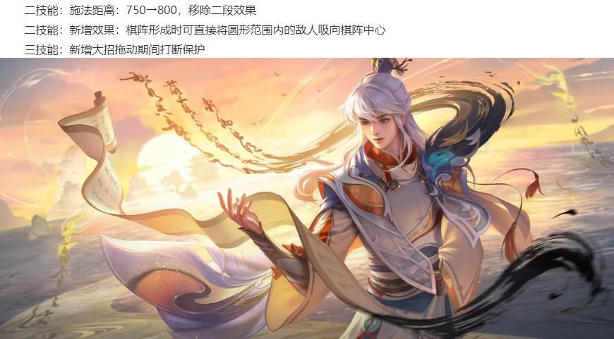 弈星加强: 2技能的施法距离增加,移除二段的吸人和伤害,2技能新增形成时附带吸人效果(有伤害), 大招新增拖动时被控,依旧可以调整大招范围,解控后就可以直接释放。