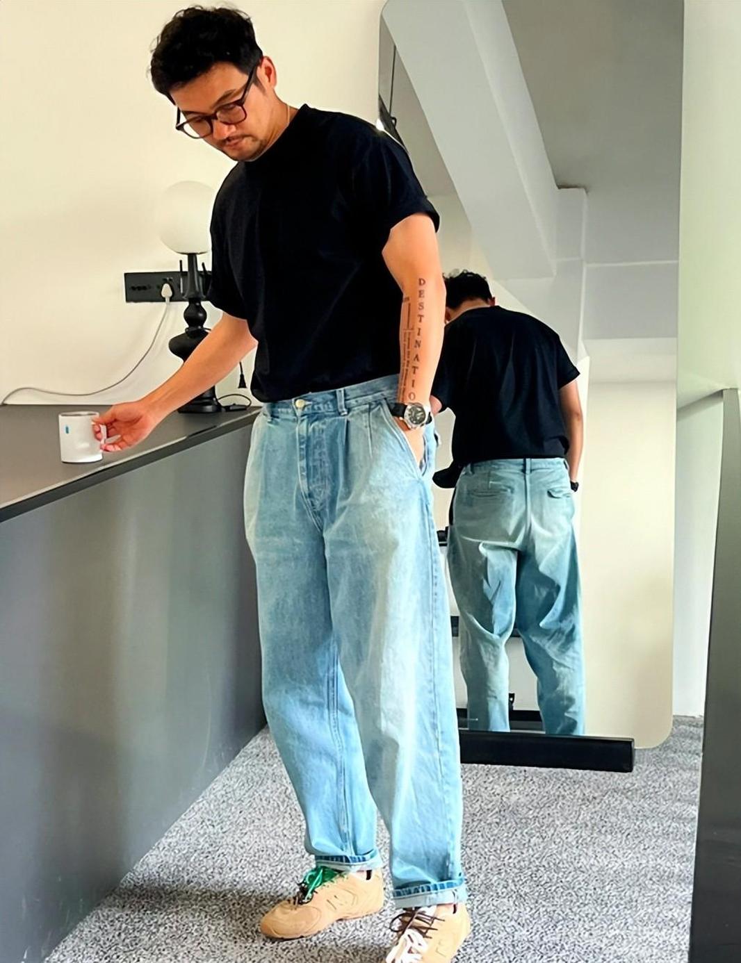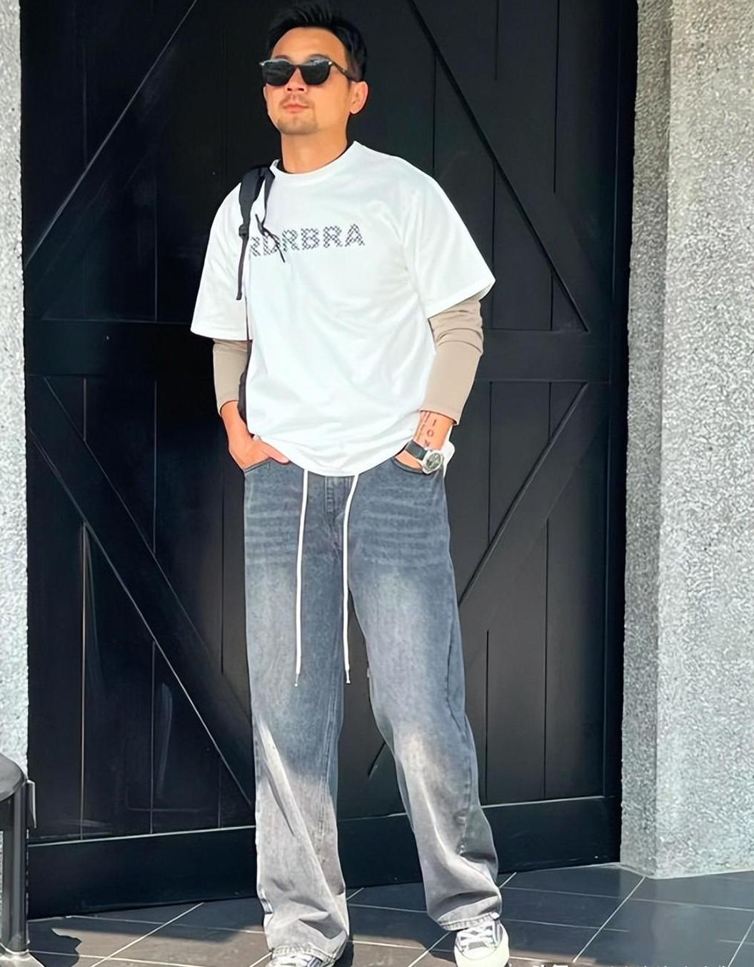 牛仔裤作为时装界的“常青树”, 自带时尚减龄属性 ,与T恤搭配可谓是天生一对,既彰显了时髦感,同时也兼顾中年男人的沉稳气质。