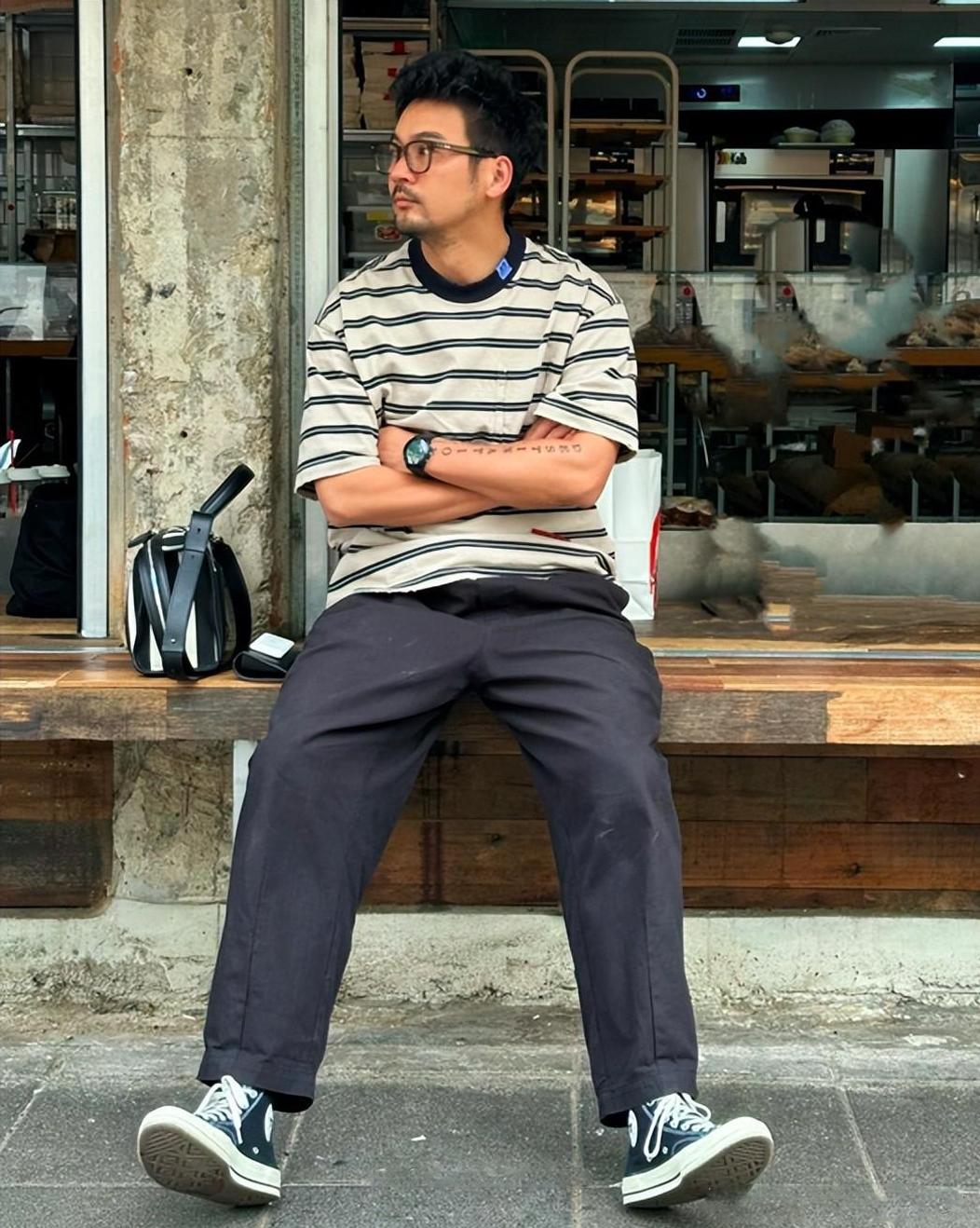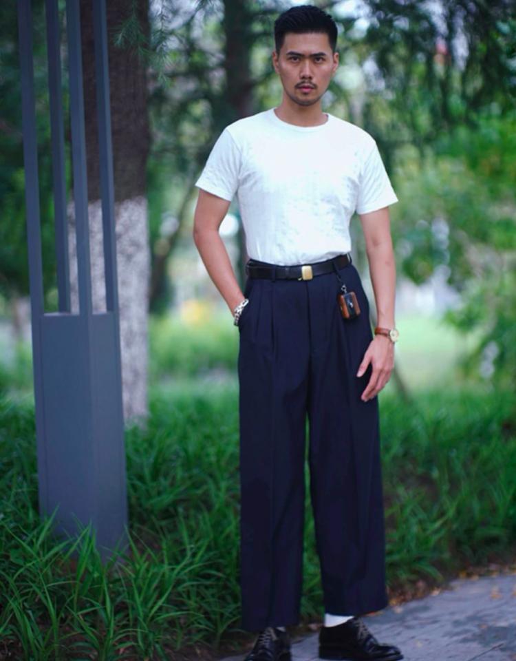 西装裤作为正式单品之一,与T恤搭配在一起后,兼顾了休闲感,避免整体穿搭老气油腻,凸显出高级时尚。