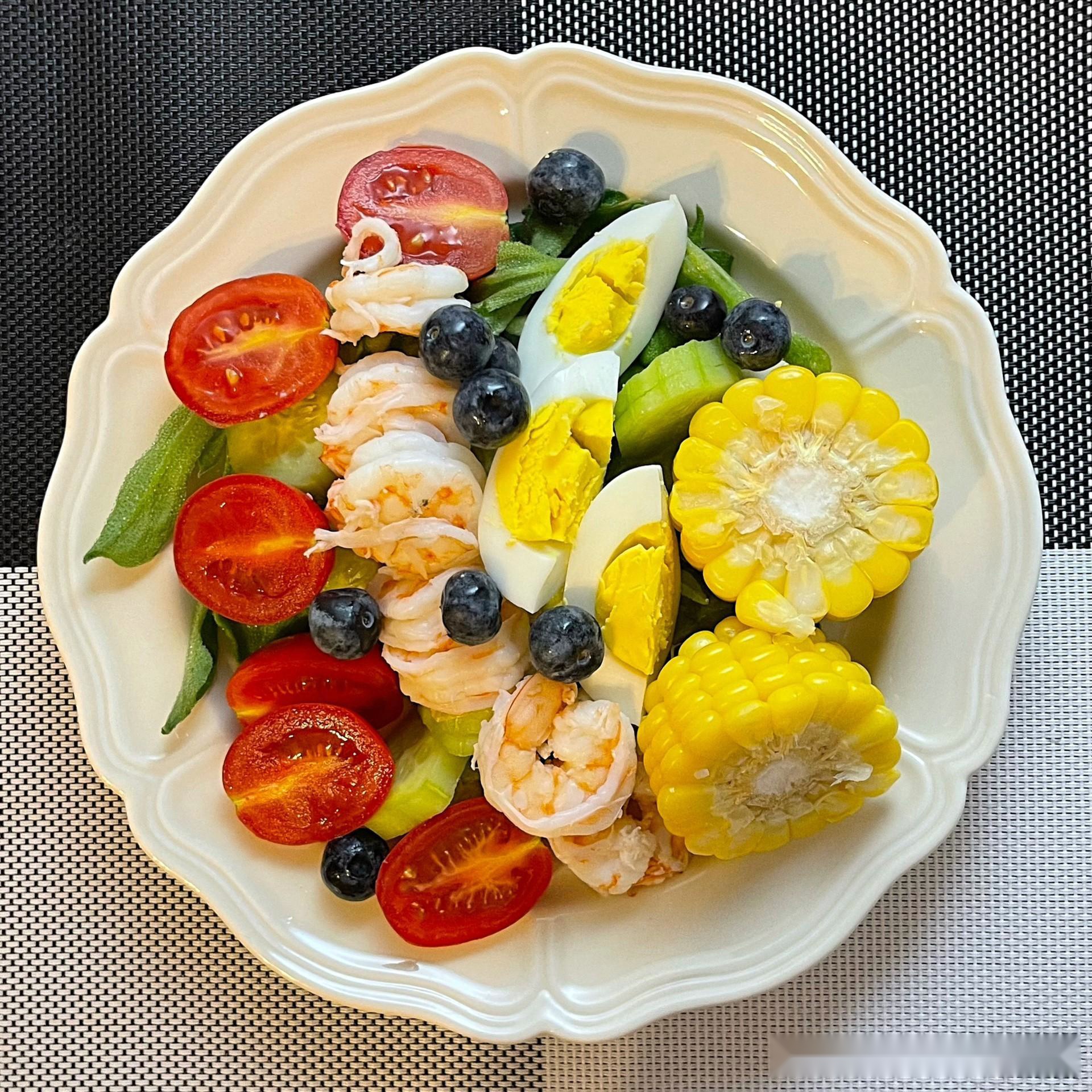 周一:80g水煮虾+一颗水煮蛋+150g黄瓜+半根玉米+几颗圣女果+蓝莓