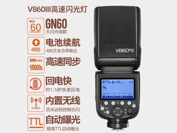 其闪光指数GN60,闪光范围为20-200mm,功率也是76Ws,支持2.4G无线,可以作为主控灯。LED造型灯也是2W。可以说,V860III也就是V1 Pro的平价版。