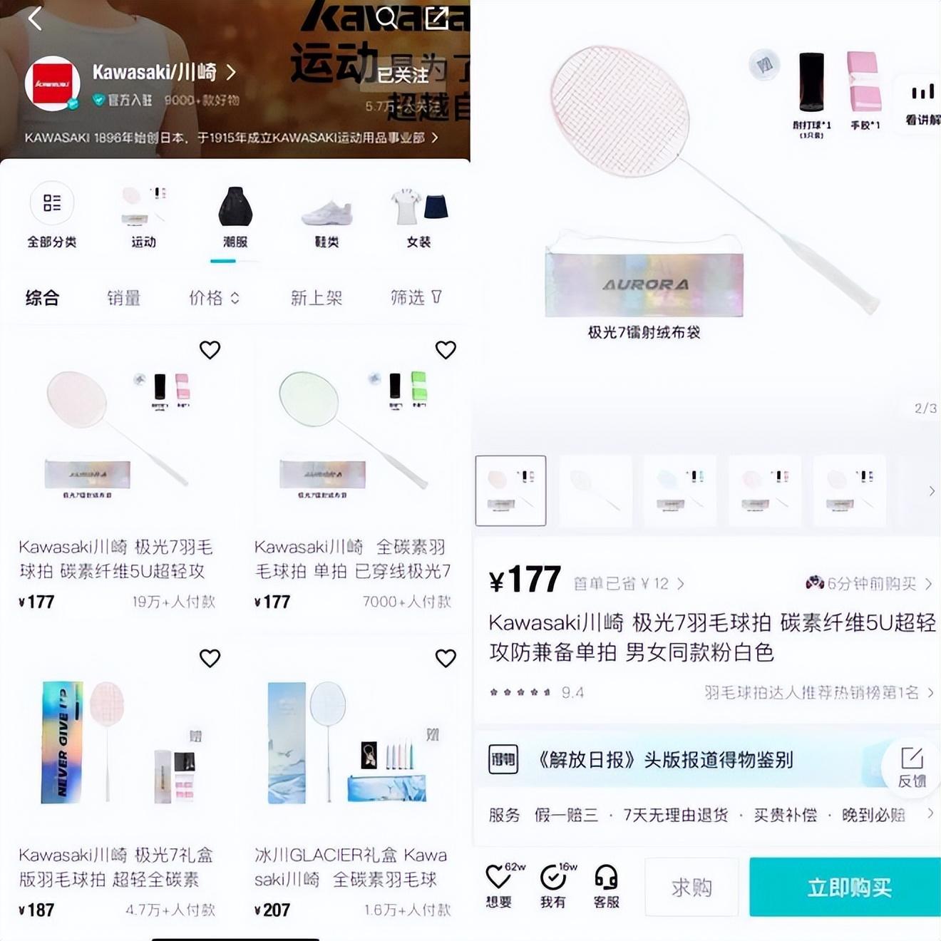 2023年,羽毛球品牌川崎在得物诞生了最大爆品——极光7球拍。考虑到市场上的大部分球拍缺乏设计感,川崎新品极光7采用渐变色设计,以极光镭射拍套提升产品外观,在得物平台上线后迅速成为爆款,有20余万人在得物购买下单。