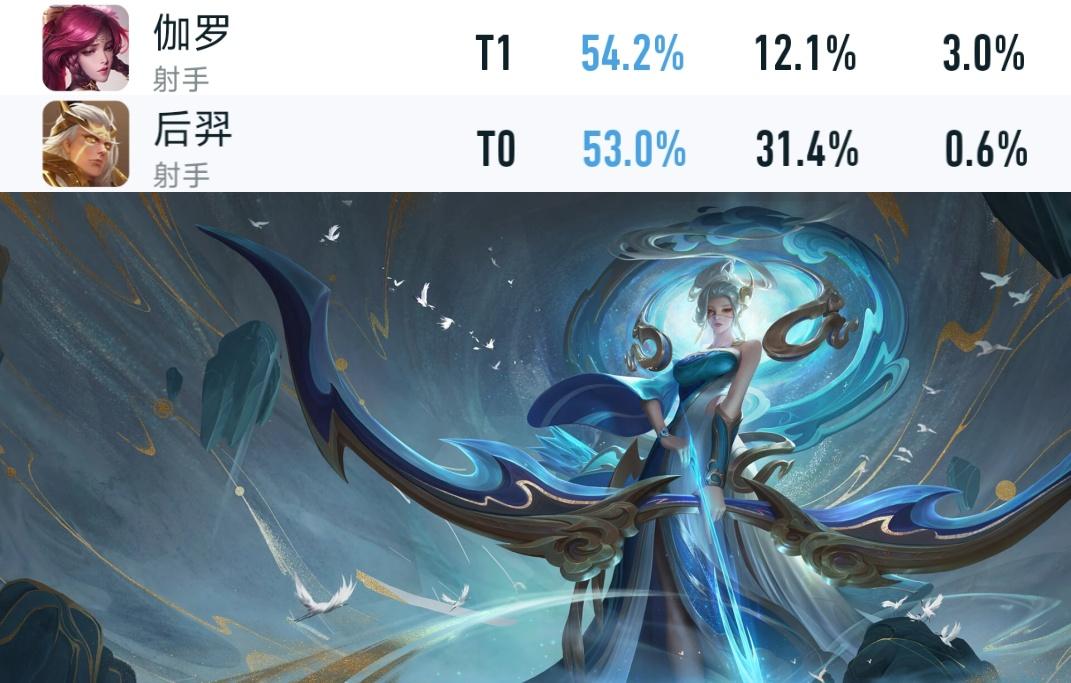 伽罗 由于2技能削弱,其 排位胜率已从54.5%下跌至54.2% ; 后羿 由于2技能削弱,其 排位胜率已从53.5下跌至53% ,这两位T0英雄依旧坚挺,非常适合用来上分。