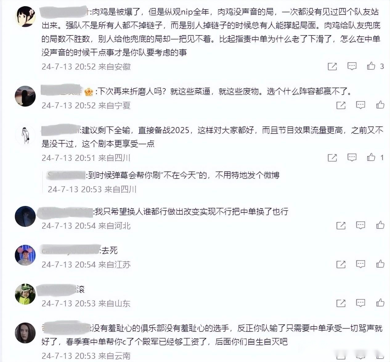 赛后NIP官博下方的评论如下,不少粉丝直言:Rookie这场确实被爆了,但是只要Rookie没声音,其他队友从来没有站出来过一次,Rookie给队友兜底很多次,却没有人能在他表现不佳的时候撑起来。也有粉丝表示:这就是赛季中不换人不补强的后果,管理层不愿意做出改变,就不会有成绩!更有粉丝嘲讽:干脆剩下的比赛全输,备战2025吧,搞个节目效果和流量。