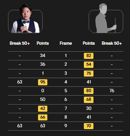 然而,经验丰富的张安达并未轻言放弃。第四局,他打出单杆 63 分,以 95 - 41 扳回一局,比分来到 3 比 1。但周金豪迅速调整,在第五局单杆 76 分,80 - 0 零封对手,4 比 1 继续掌控局面。第六局,周金豪以 68 - 50 获胜,5 比 1 几乎锁定胜局。
