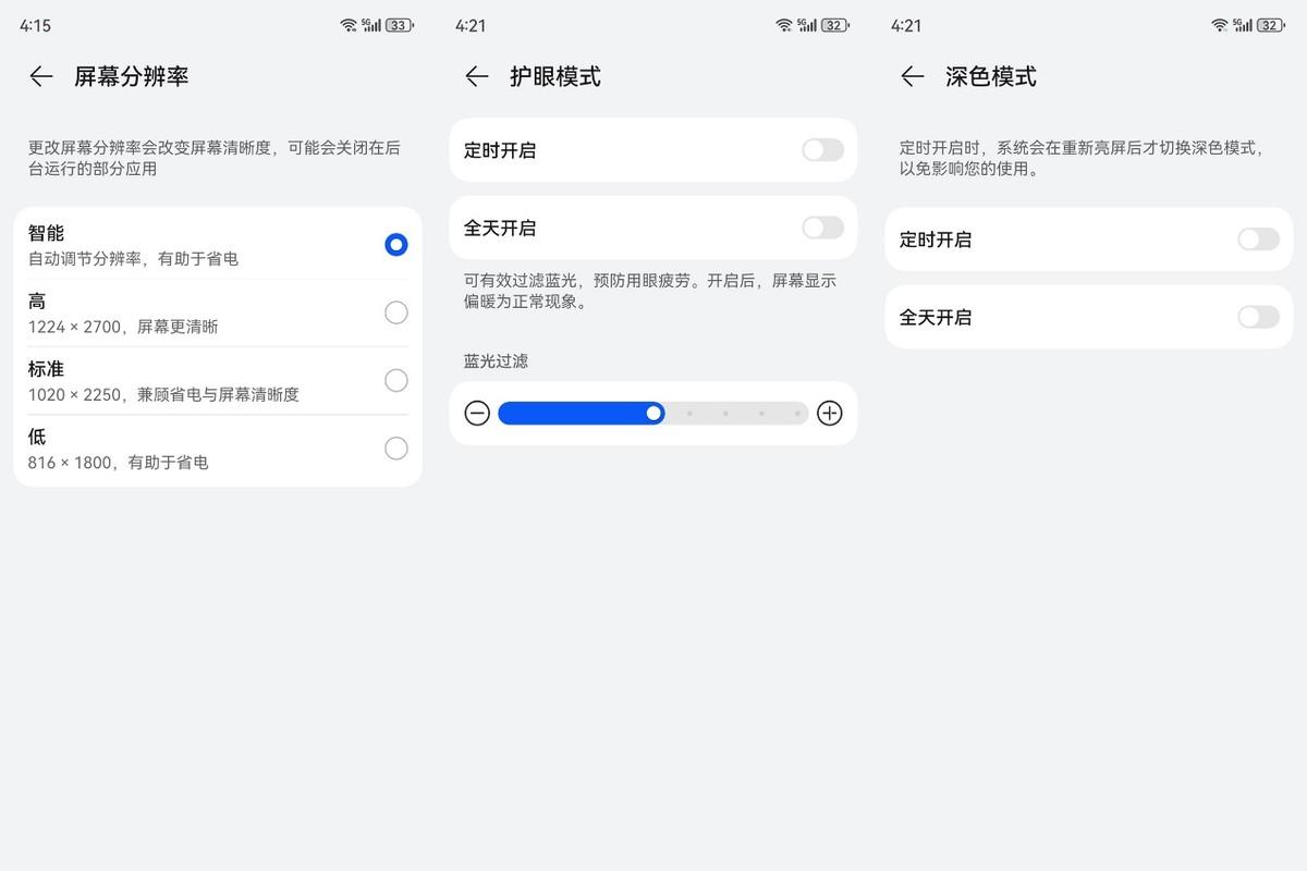 这块6.78英寸、1.5K屏幕不但能带来更绚丽的显示效果,也支持分辨率动态切换来让手机更省电。它还有足够强大的护眼功能,可以设置定护眼模式或者深色模式,也可以设置蓝光过滤强度,可以定时开启也可以全天开启。