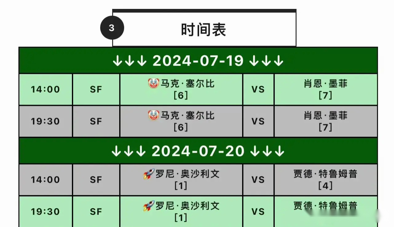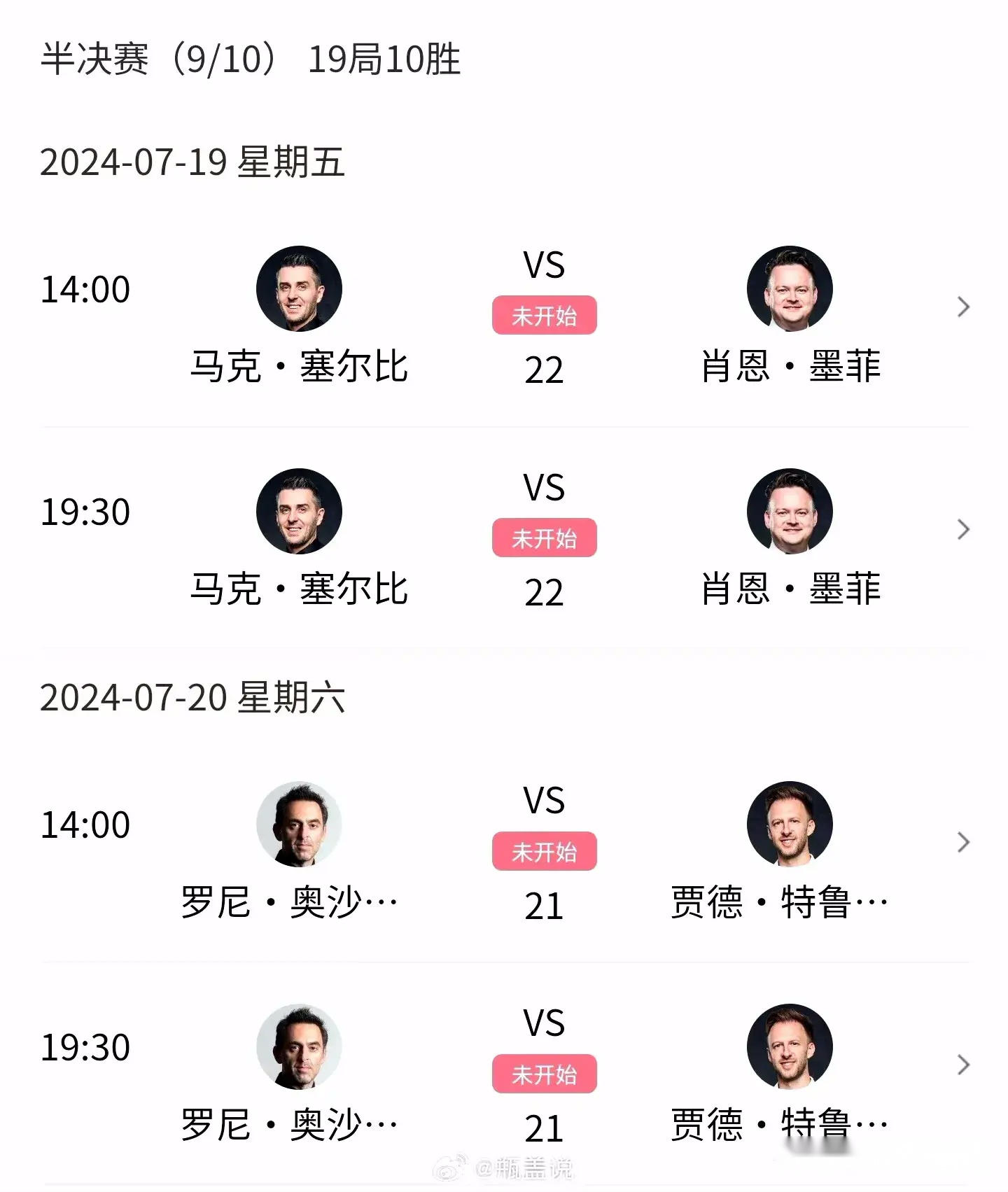4位中国选手都倒在了英国选手之下,因此最终晋级2024斯诺克上海大师赛的4位选手分别是马克·塞尔比、肖恩·墨菲、罗尼·奥沙利文和贾德·特鲁姆普。根据赛制安排2024年7月19日半决赛第一场将打响,半决赛采用的是19局10胜制的比赛赛制,比赛将分为2个阶段进行,具体赛程安排如下: