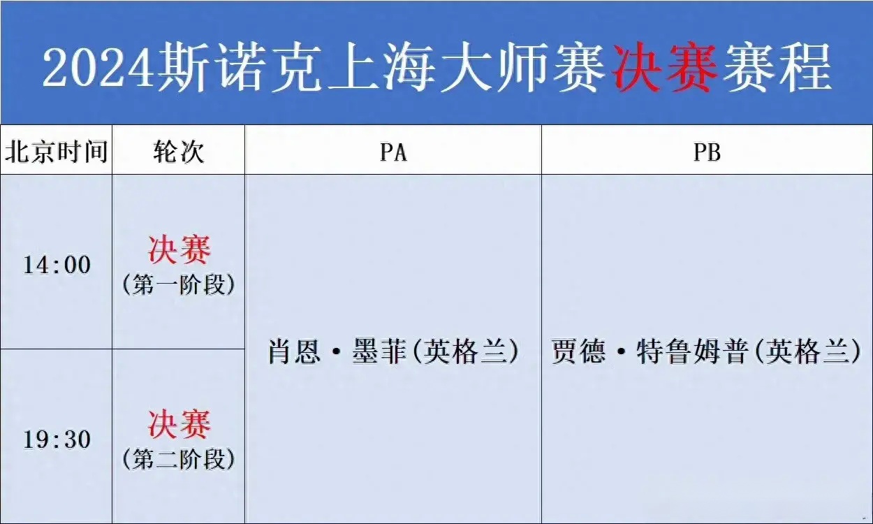 北京时间2024年7月21日,2024年斯诺克上海大师赛决赛将 争夺,决赛的对手分别是贾德·特鲁姆普和肖恩·墨菲,比赛将被分为两个阶段进行,第一阶段14时开始,第二阶段晚间19时30分打响,赛制采用的是21局11胜制,两位英格兰名将谁将最终拿下210000英镑的冠军奖金?