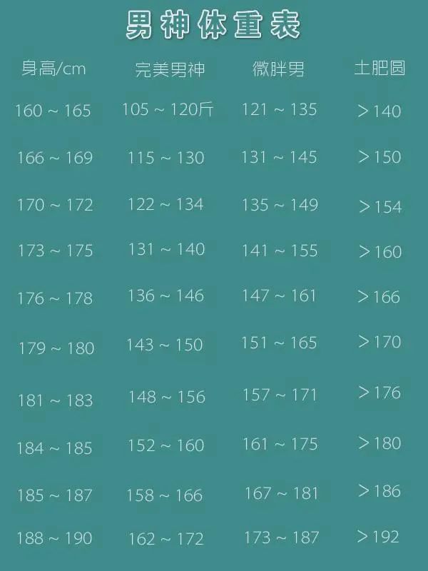 我们可以看到,身高越高的人,对应的标准体重也是放宽的,所以,我们不能因为一个体重数值就觉得自己胖了。 真正的内行人知道 ,体重不是衡量胖瘦的唯一指标,体脂率才能反映身材情况。
