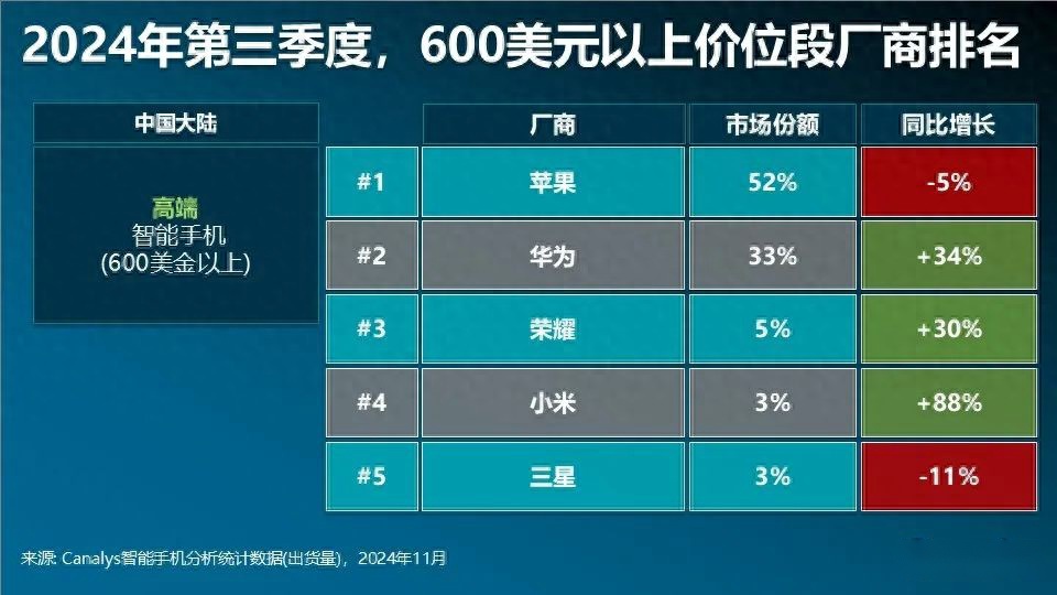 最近第三季度国内高端机榜单已出,在这个榜单中,苹果霸榜,但是华为增长迅速,而小米荣耀也在前五之中。而在第四季度,由于小米15系列的登场,小米在4000元以上手机市场迎来爆发。