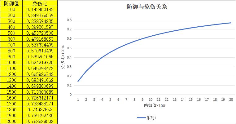 从图表中可以看出,防御和免伤是成正比关系, 公式为:免伤比例=防御值/(602+防御值) ,防御值越高则免伤越高,但 免伤随着防御的增高,提升幅度也越来越小。 当防御值达到602点时,免伤比例正好是50%。所以,最开始提升防御时的收益最大,一件防御值就可以获得高额免伤,比如90护甲的布甲,在1级150护甲时提升8.5%的物理免伤,在1500点护甲时提升1%的物理免伤,所以前期不要小瞧它。