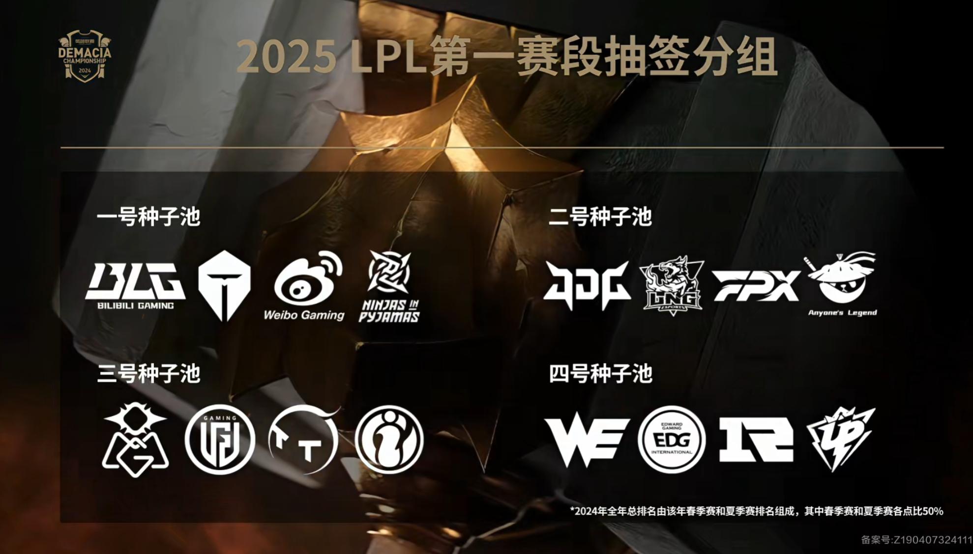 然后是抽签的种子池,如下图,可能很多人疑惑为什么NIP在一号种子池,其实很简单,这个种子池是按照2024春、夏两个赛季的常规赛、季后赛排名来定的,而且季后赛的积分权重比春季赛更高,那么2025赛季第一赛区段的抽取结果如何呢?