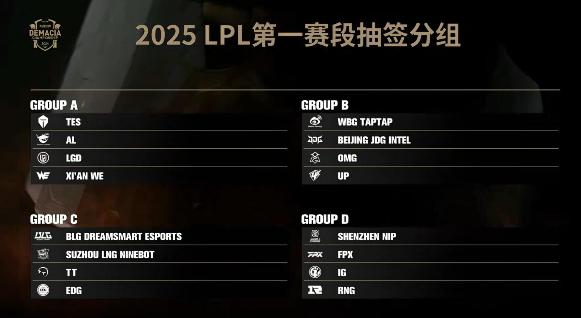 伴随着AL以3-1击败TES成功拿下2024德杯冠军之后,LPL赛区的2025赛季第一赛段的抽签仪式也即将开始了,在抽签之前,我们先了解下第一赛段的一些信息,首先这个赛段的小组赛将会把16支队伍分为4组,每组进行BO5单循环,排名前2进入下一轮,比赛采用双边全局BP模式。