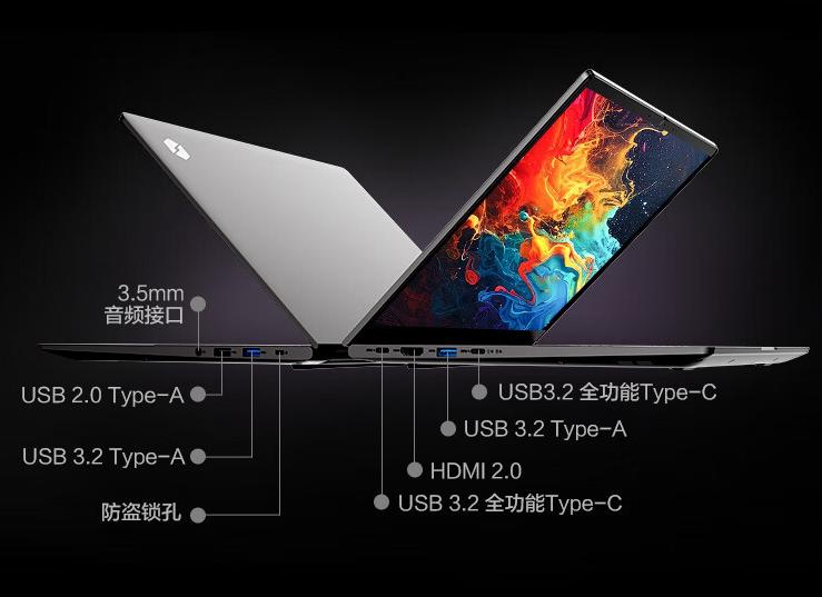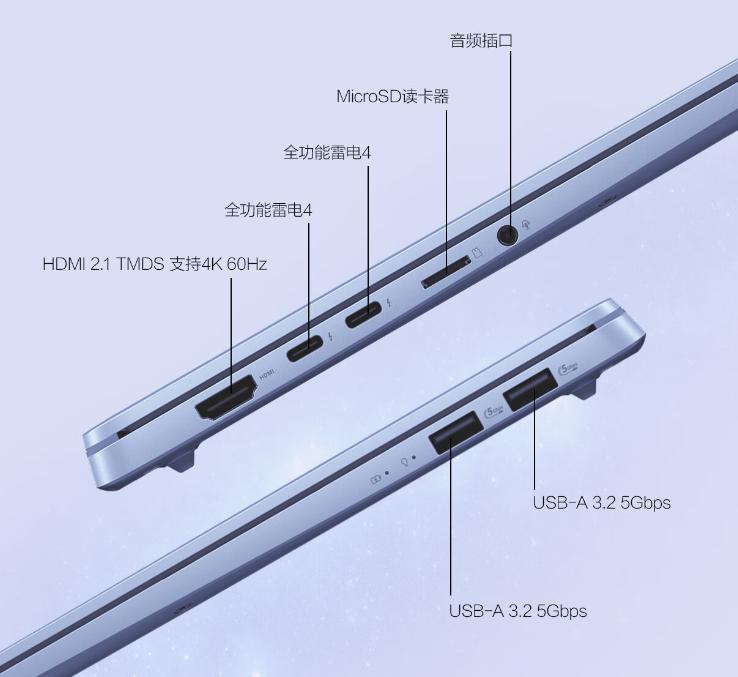 接口有3A,2C,还有HDMI以及音频接口,十分丰富。网络为双天线Wi-Fi 6,60Wh电池,重量1.39Kg。